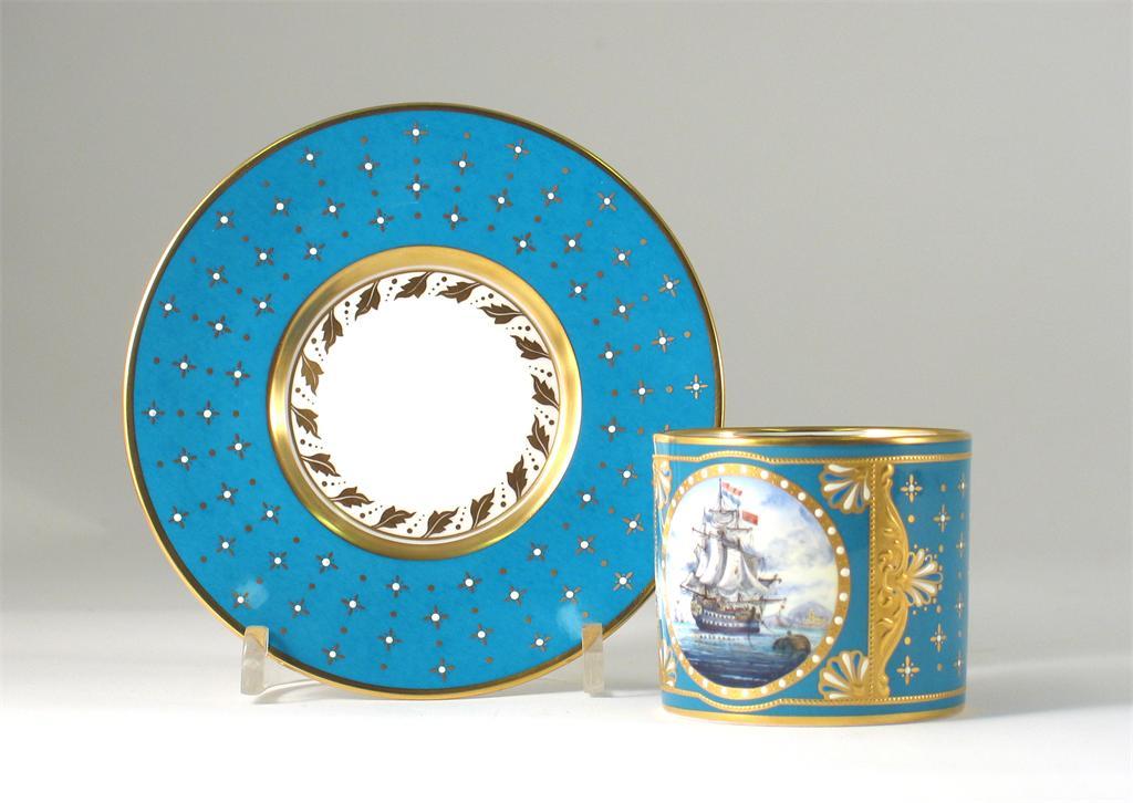 A coffee can and saucer, painted by Nowacki with a war ship on a blue, gilt and jewelled ground. (2)