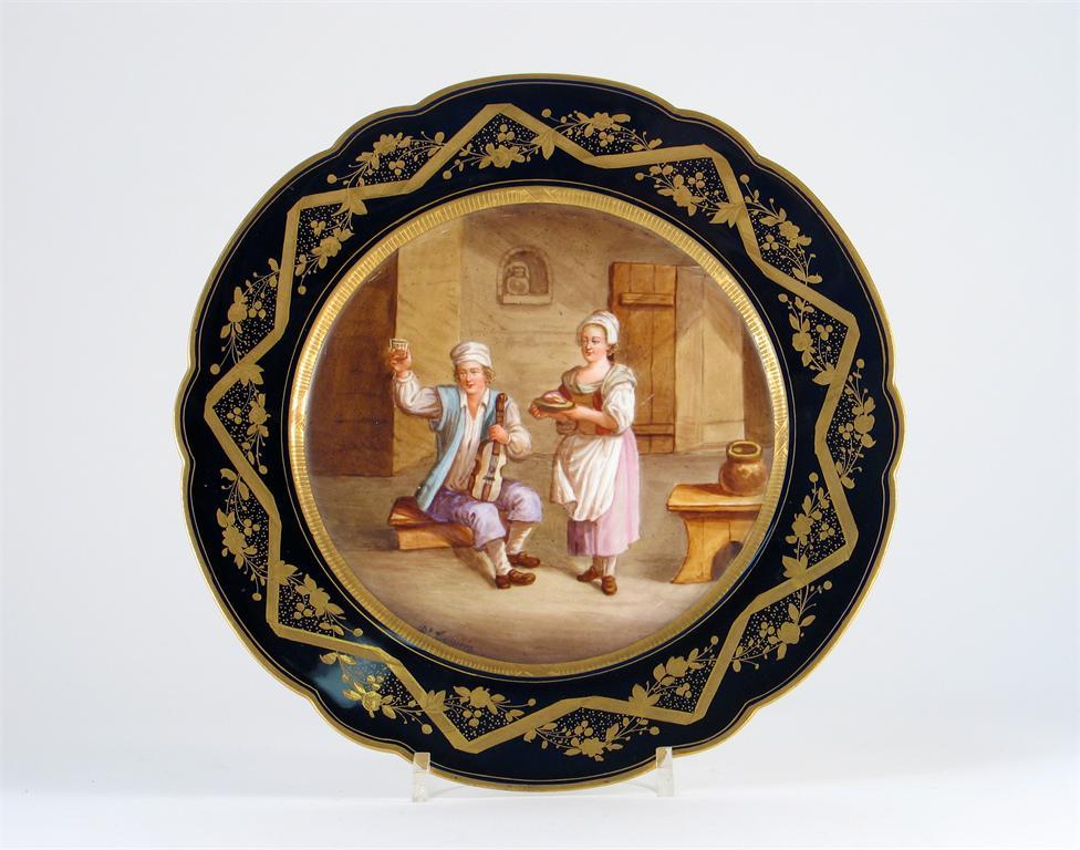 A Svres style plate, painted with a couple in an interior, signed 'Teniers', interlaced 'L' mark, 19th century, 24cm.