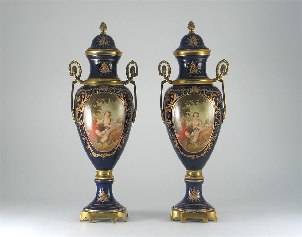 A large pair of modern Svres style vases, decorated with panels of figures on a blue ground, 49cm. (4)