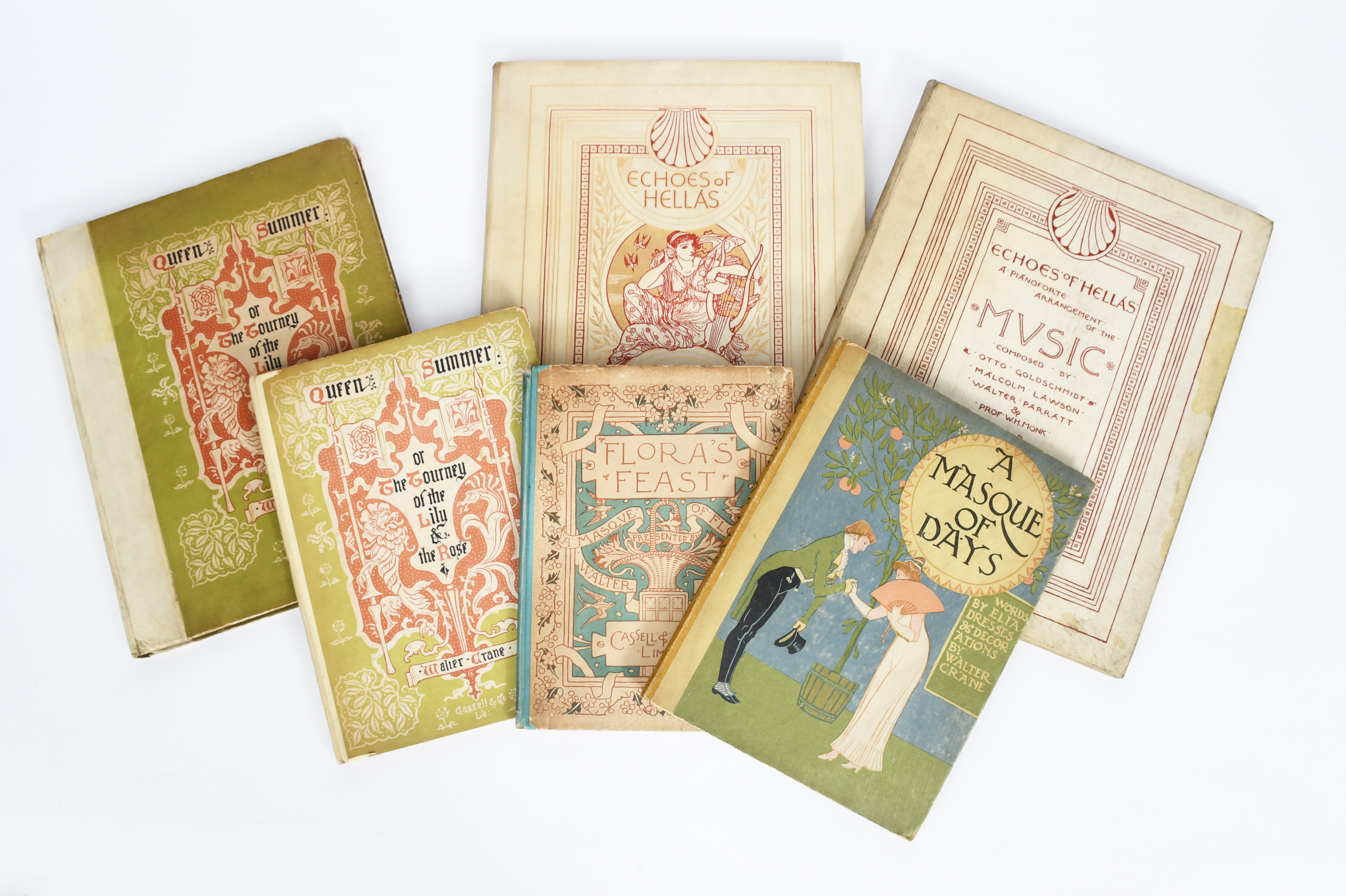 large, numbered edition book published by Cassell & Co. 1891, lithographs in colour by Walter Crane, The Work of Walter Crane, Easter Art Annual, 1898, Shakespeare The Merry Wives of Windsor published by George Allen, 1894 and illustrated by Walter Crane, The Tempest, eight illustrations by Walter Crane published by J M Dent 1893, Echos of Hellas, two volumes published by Marcus Ward, 1888, and a collection of books illustrated by Walter Crane, (a lot)