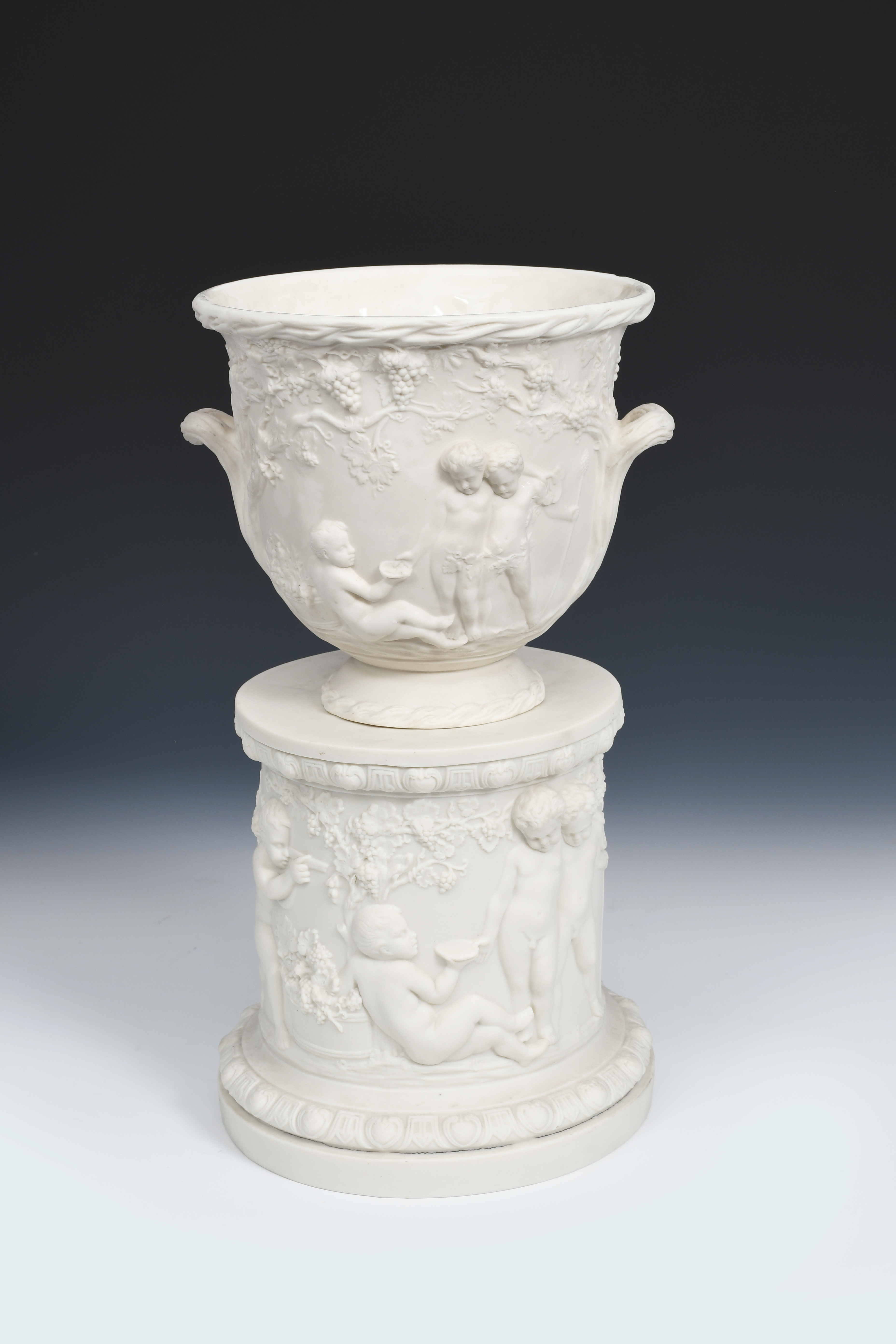 A Copeland Parian Ware jardiniere and stand, cast in low relief with Bacchanalian children collecting grapes from a grape vine, two graduated Parian Ware trumpet vases cast with sea nymphs, a Parian Ware plaque of Prince Albert from a plaque by Megret, another plaque and two Parian Ware jugs, stamped Copeland 40.5cm. high (8)