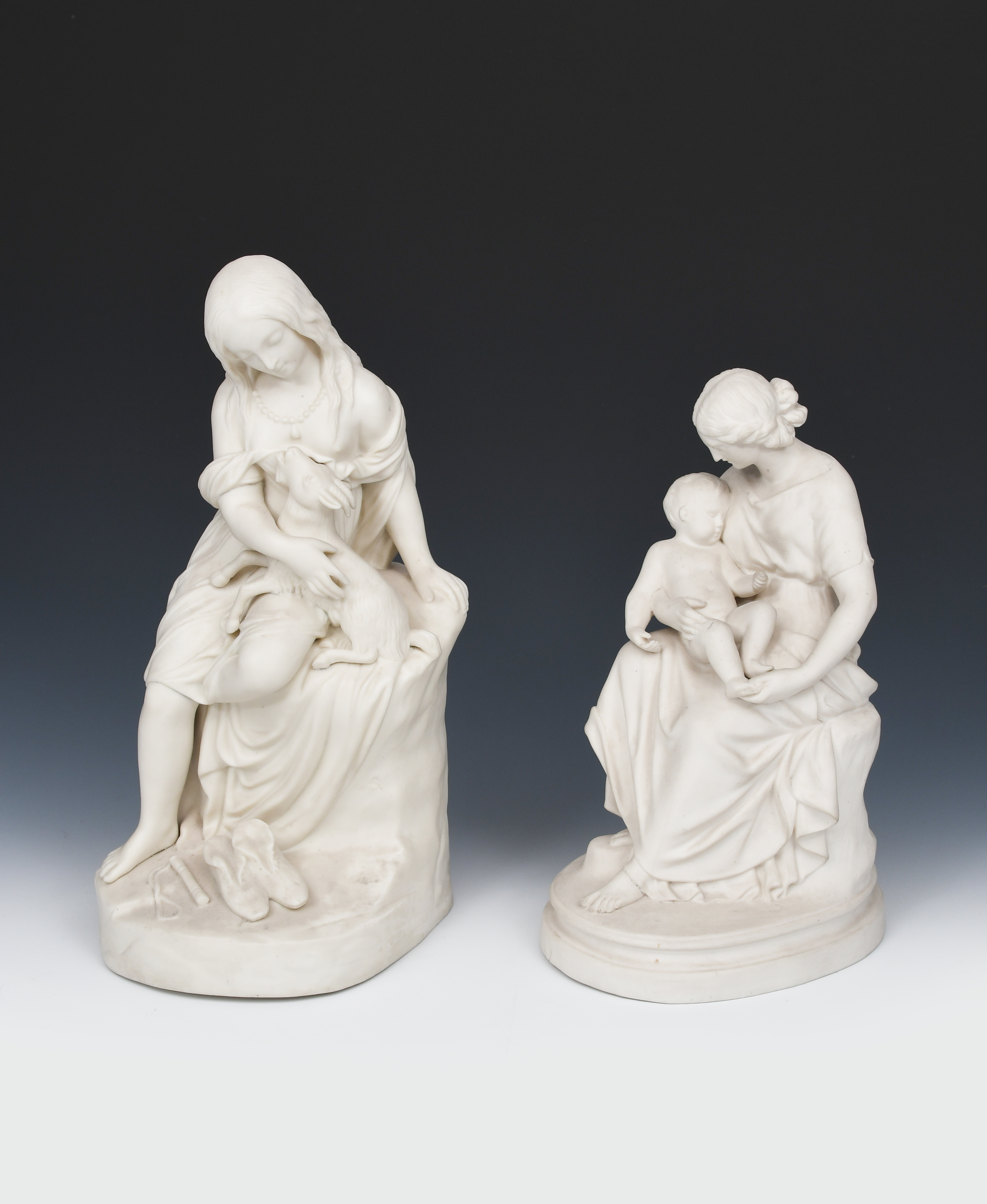 'Maria' a Turner & Co Art Union of Great Britain Parian Ware figure, modelled as a woman resting with a goat, and another Parian Ware figure group model 156, impressed marks, damages, 35cm. high, (2)