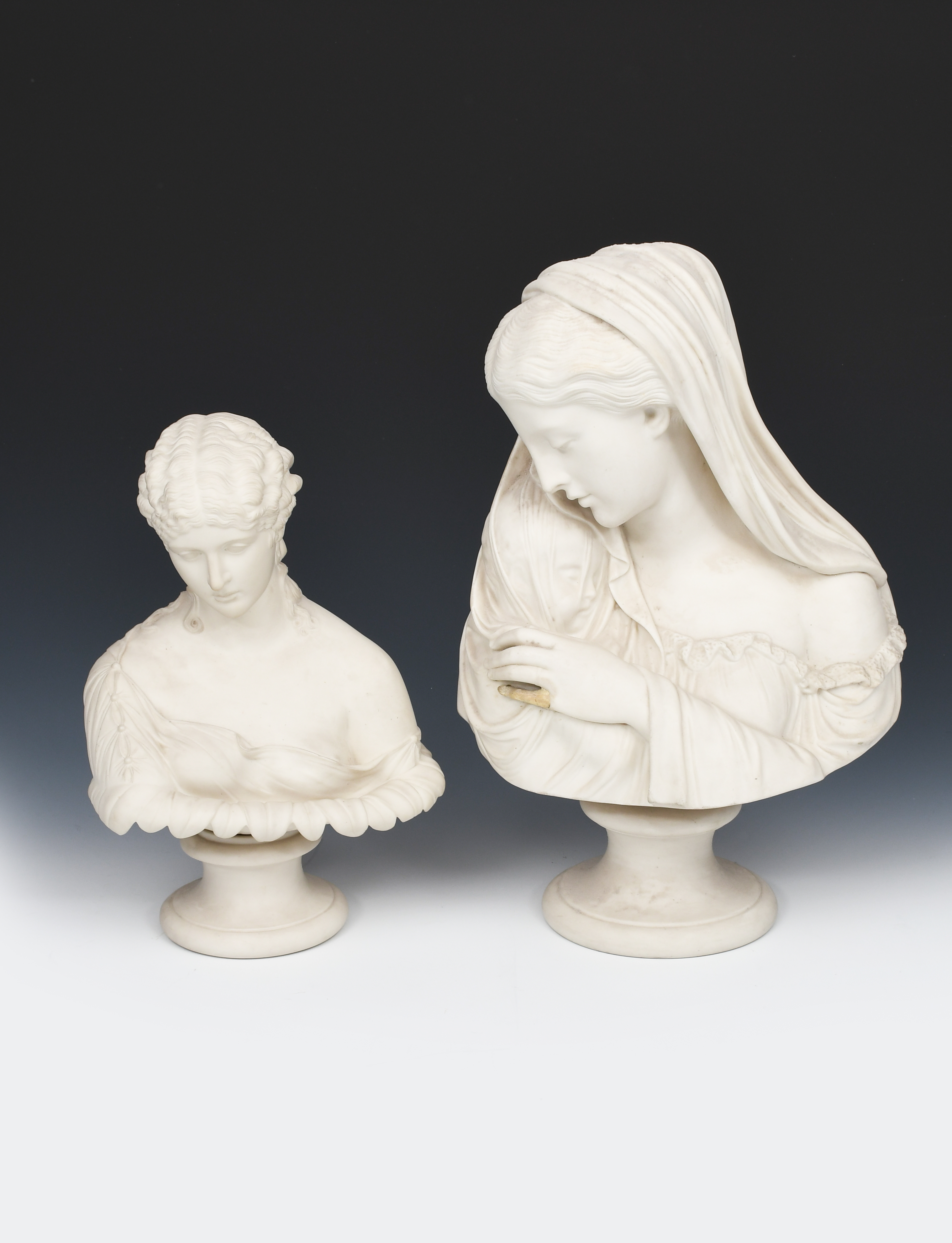 'Daphne of Clitie' a Parian Ware bust, on waisted socle, and another large Copeland Parian Ware Ceramic and Crystal Palace Art Union bust of a woman casting a downward gaze, on waisted socle, main unsigned, Copeland bust old museum restoration to her little finger, 29cm. high (2)