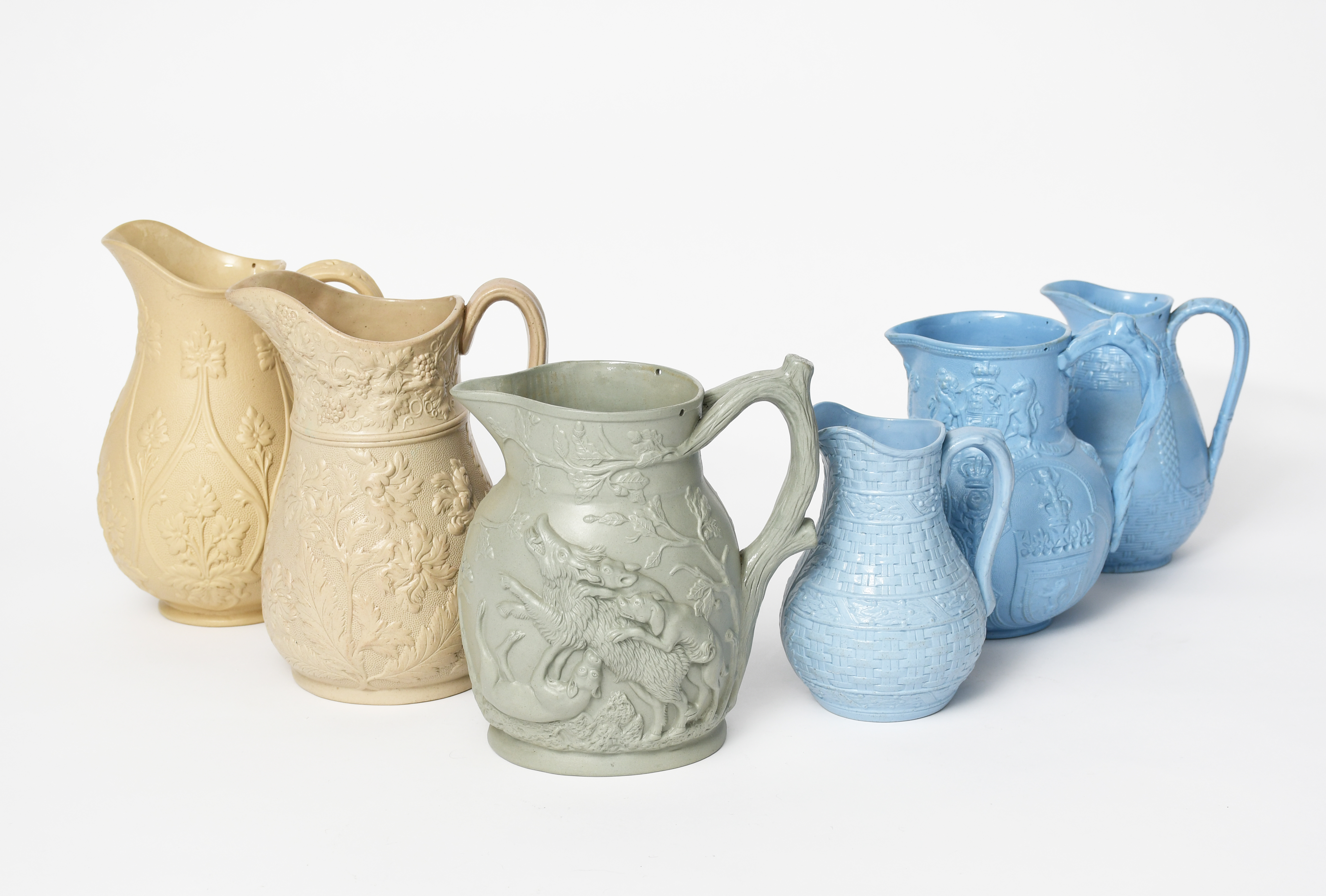 A large collection of Victorian press-moulded jugs, various makers factory marks, (a lot)