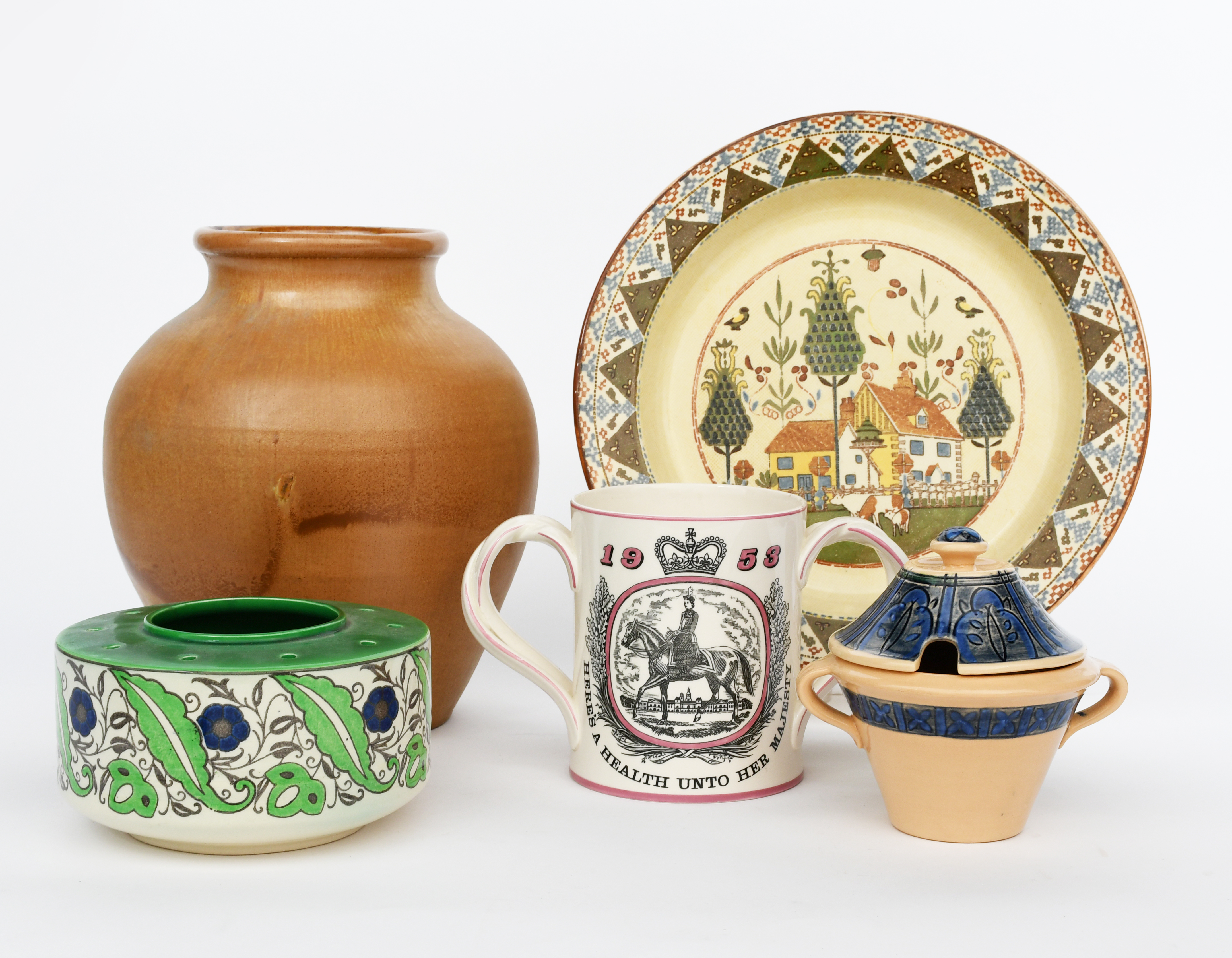 A Royal Doulton Brangwyn Ware small tureen and cover designed by Frank Brangwyn, decorated in low relief with bands of stylised foliage in blue, on a cream ground, two Royal Doulton vases designed by Frank Brangwyn covered in a green glaze, a Royal Doulton Titanium Ware pieces, a Royal Worcester Sabria Ware vase, a Royal Doulton Kings Ware jug, a Royal Doulton Sampler Series Ware large plate, Lady With a Pearl Necklace a Beswick wall plaque, and a collection of ceramics including Doulton, Bullers and Denby Danesby Ware, printed factory marks, V&A paper label, 14cm. high, (a lot)
