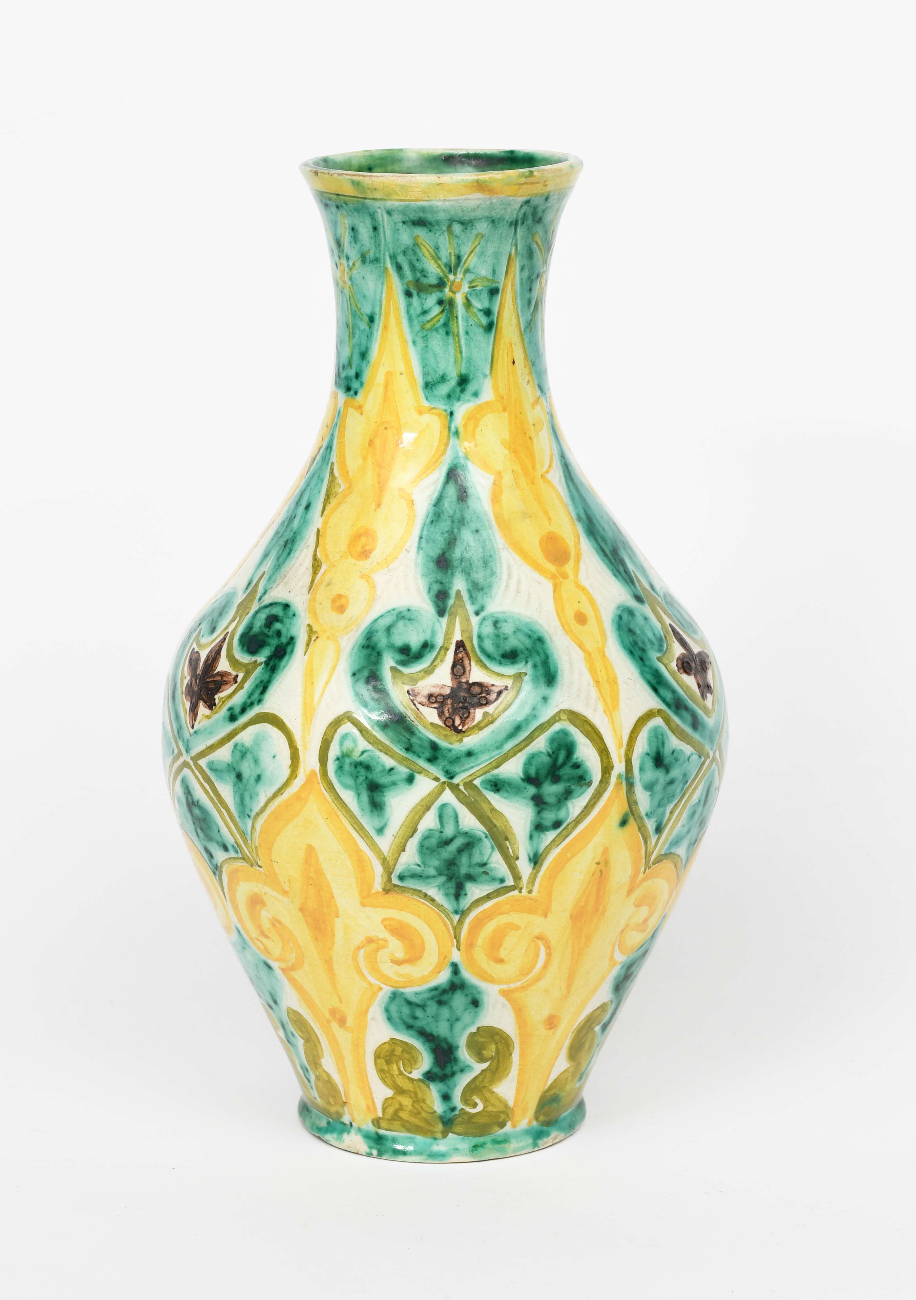 A Della Robbia Pottery vase by Hannah Jones, shouldered ovoid form with flaring cylindrical neck, incised and painted with stylised foliage in green and yellow, highlighted with brown on a white ground, incised Della Robbia marks, painted HJ monogram, 25.5cm. high