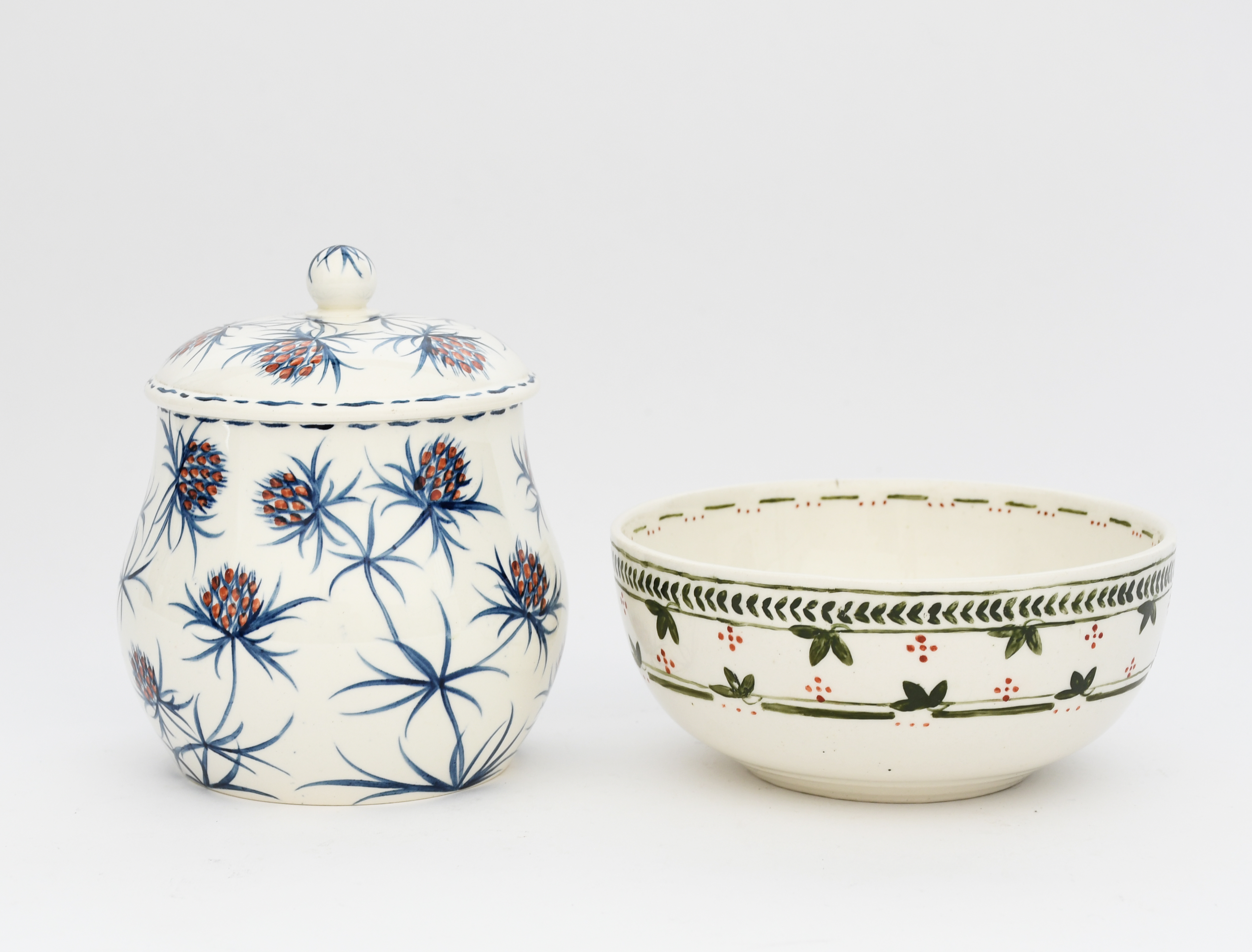 A Wedgwood Pottery vase and cover painted by Grace Barnsley, swollen cylindrical form, the cover with ball finial, vase and cover painted with flower stems in blue and red on a white ground, and a Wedgwood bowl dated 1912, painted with green ivy borders, impressed Wedgwood painted GB monogram and 187, bowl painted G F M monogram, 12cm. high, (3)