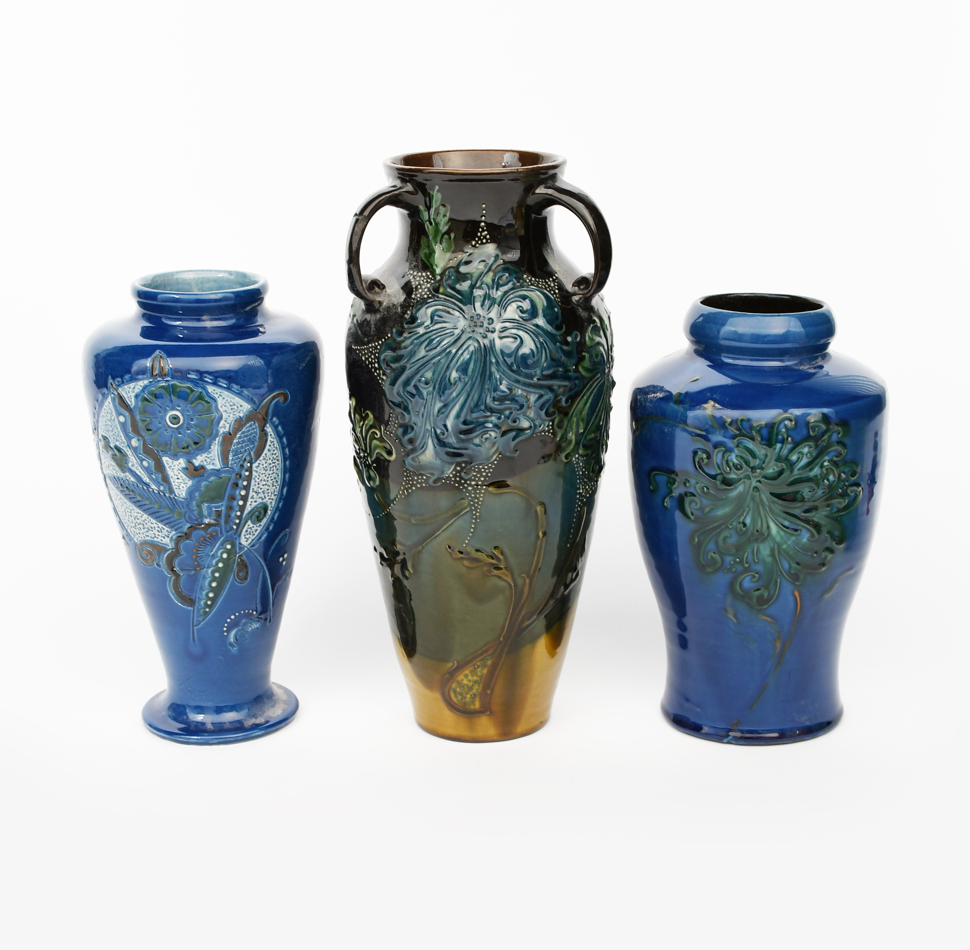 A C H Brannam Barum Ware vase by Frederick Braddon, dated 1907, shouldered form with three applied handles, slip decorated with Art Nouveau flower stems, in shades of blue, green and brown on a graduated ground, a Brannam vase decorated with a similar flower on blue ground, and another Brannam vase similar, incised marks, 28.5cm. high (3)