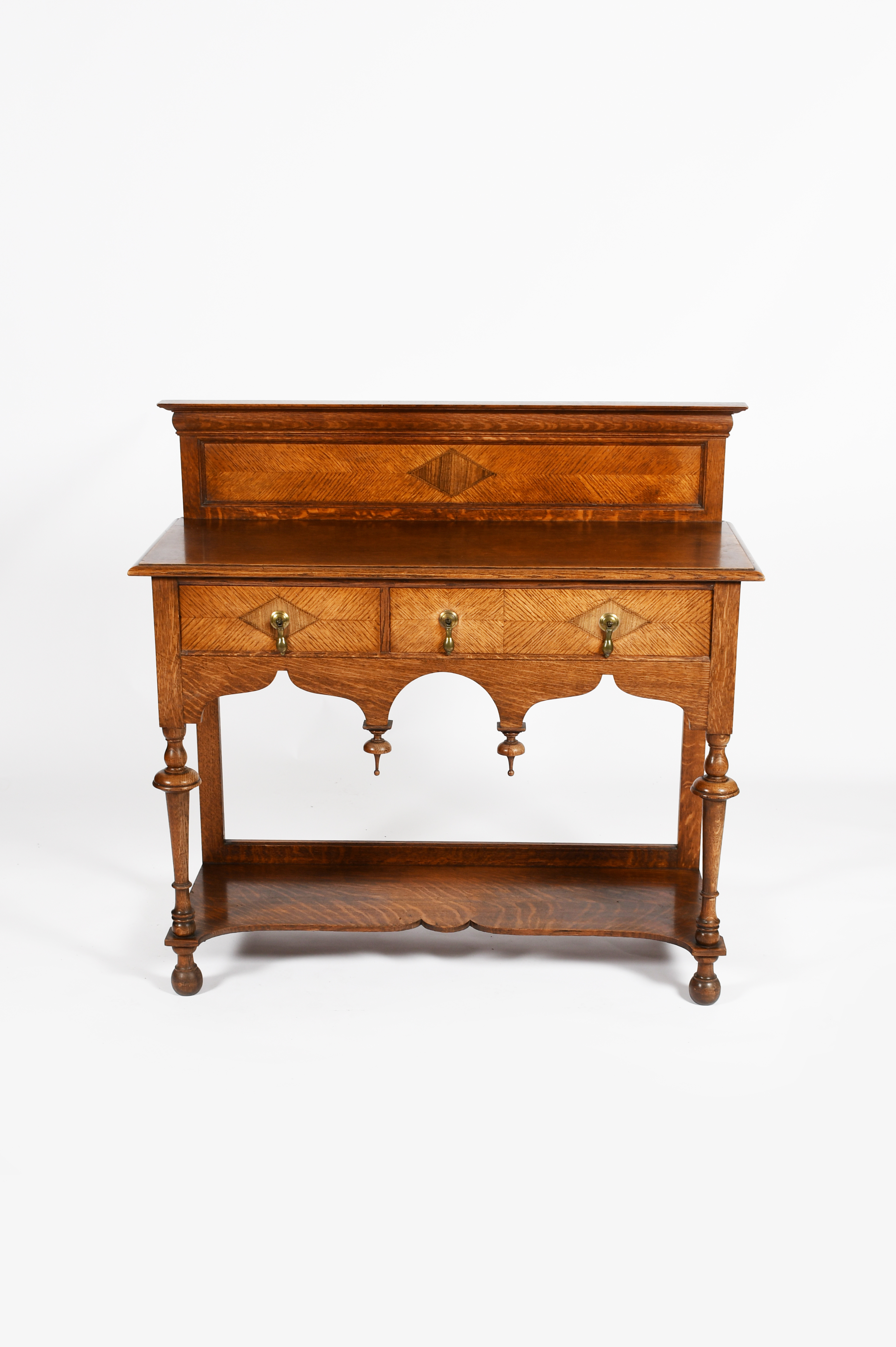 An oak sideboard, rectangular with back rail, over three drawers and shaped rectangular shelf, turned legs and bobbins, unsigned, 106cm wide, 43cm deep, 103cm. high