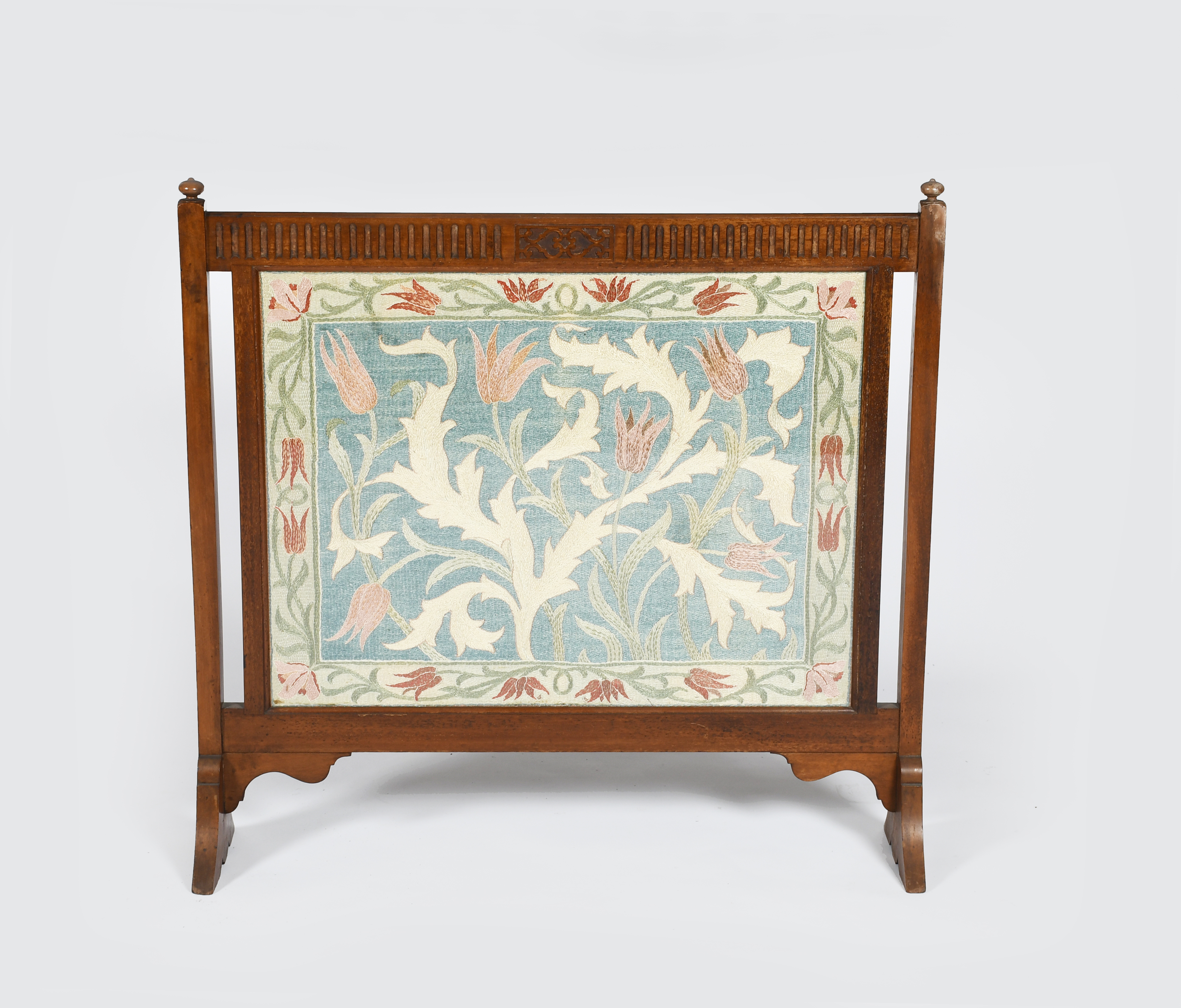 A Morris & Co silk embroidery, mounted in a carved mahogany fire screen, unsigned, 89cm. wide, 86cm. high