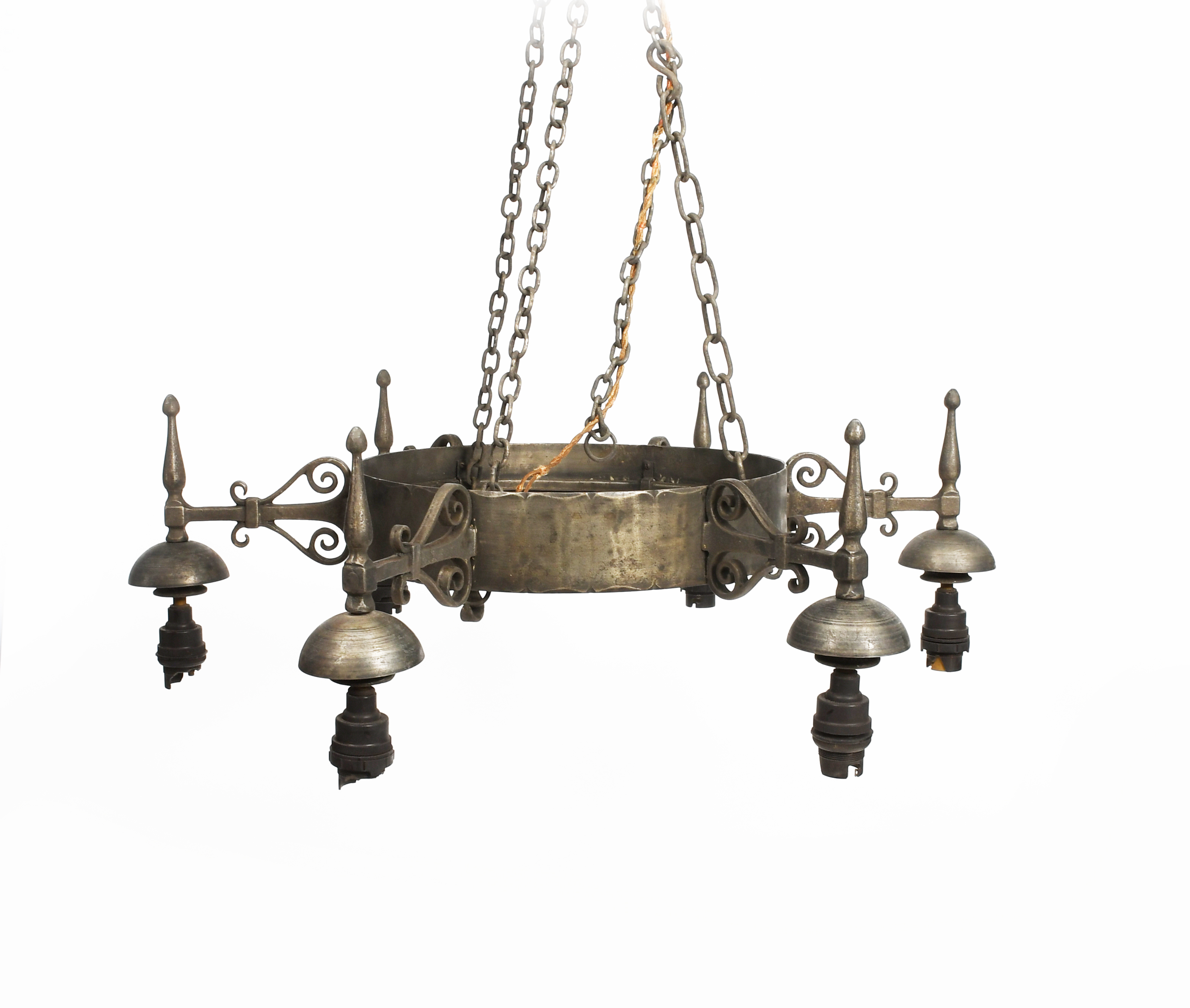 A patinated steel ceiling light, circular frame with radiating scrolled arms, with semi-circular sconce and fittings, on chains, unsigned 63cm, wide