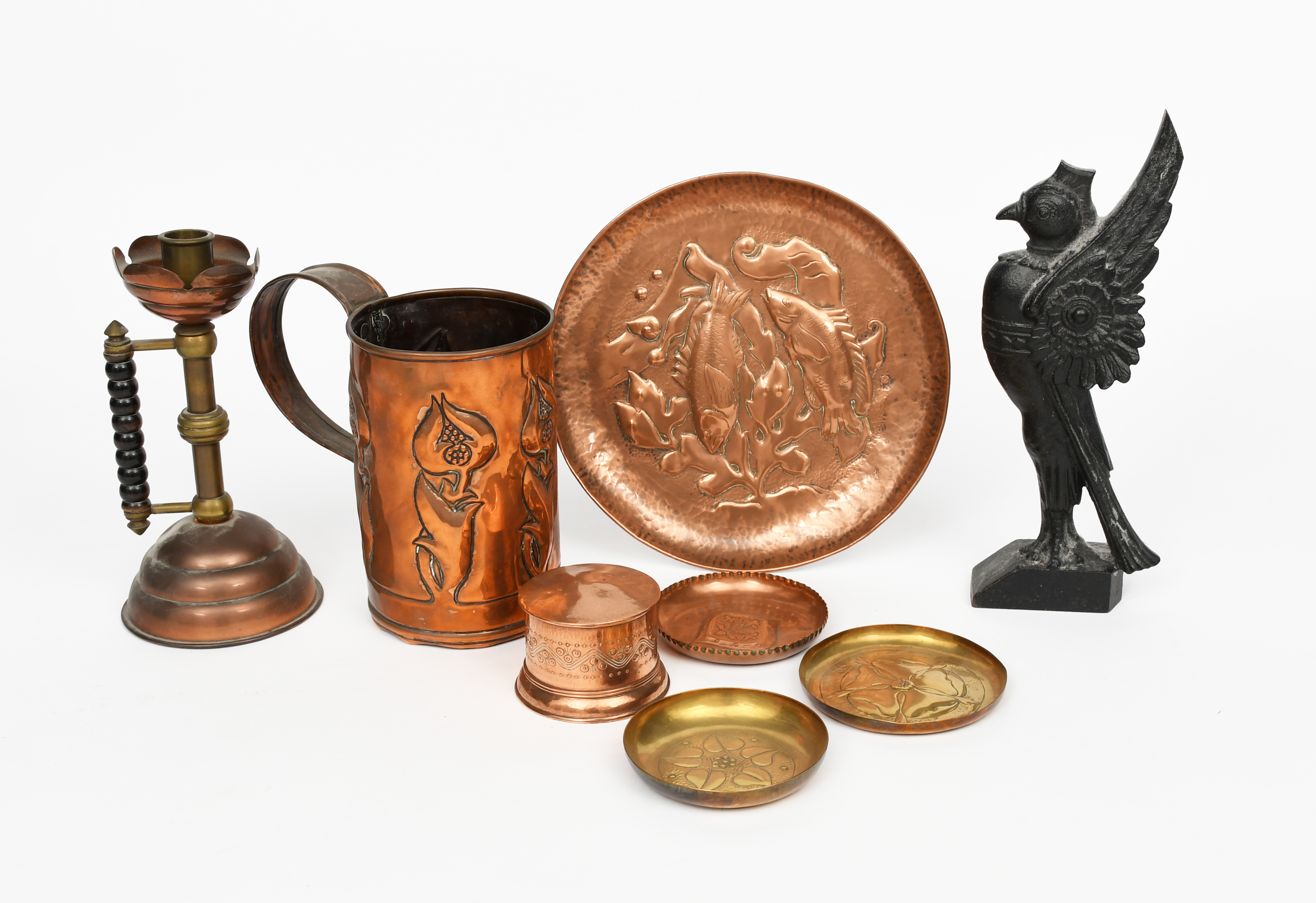 A repousse copper plate probably Newlyn Industrial Classes, hammered in low relief with three scaly fish swimming amongst waterweed, a Keswick School of Industrial Arts copper box and cover, two dishes and candlestick probably KSIA, a single handle copper vase and a collection of metalware, unsigned, 23cm. diam. (a lot)