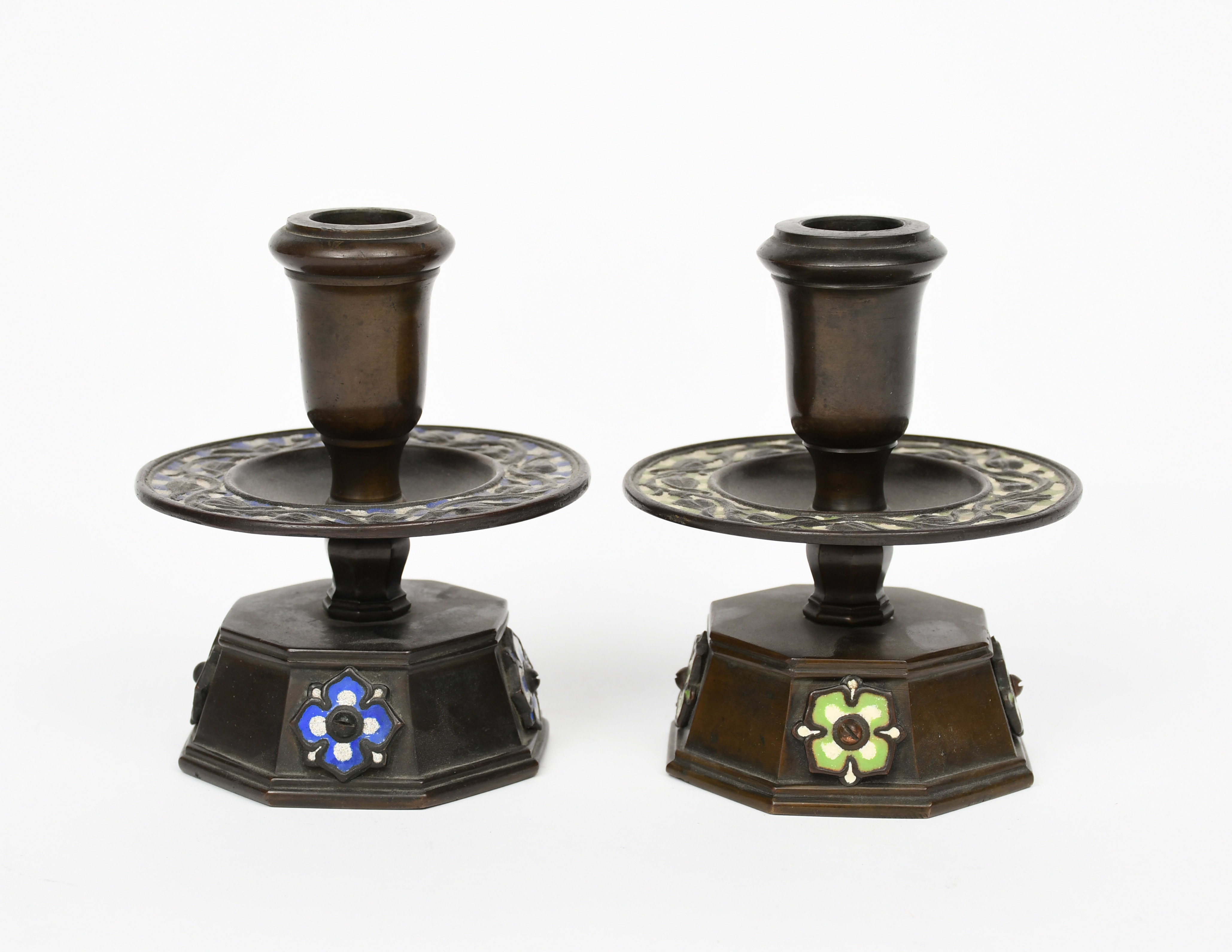 A pair of enamelled bronze candlesticks, tapering octagonal bases each set with four flowerhead panels, with circular drip tray, with similar band of foliage with enamel, in shades of green and white and blue and white unmarked, DRC paper collection label, 12.5cm. high, (2)