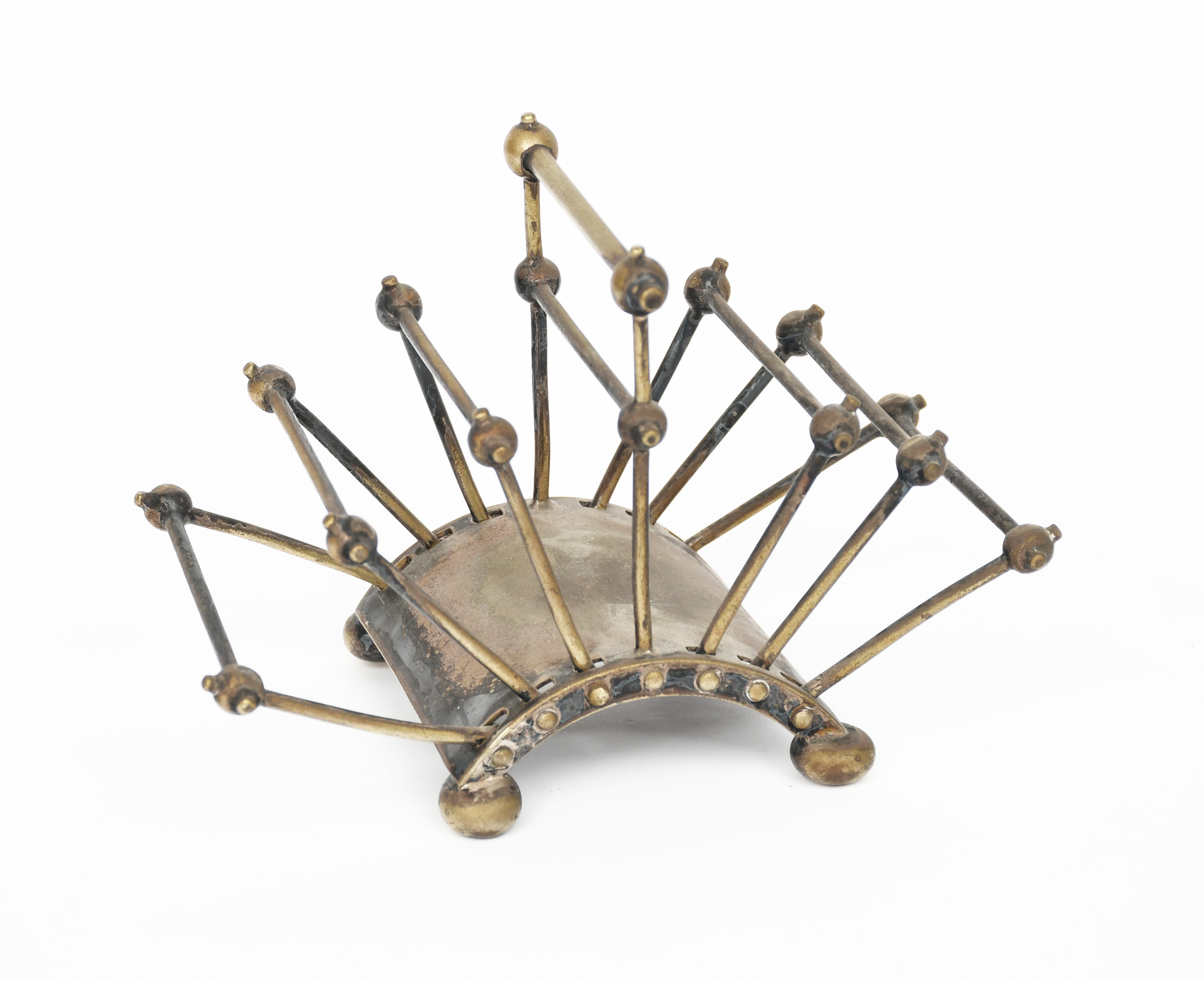 A Hukin & Heath electroplated metal letter rack designed by Dr Christopher Dresser, model no. 2555, arched rectangular base on bun feet, set with articulated rod and ball dividers, stamped Hukin & Heath marks, 12.5cm. high