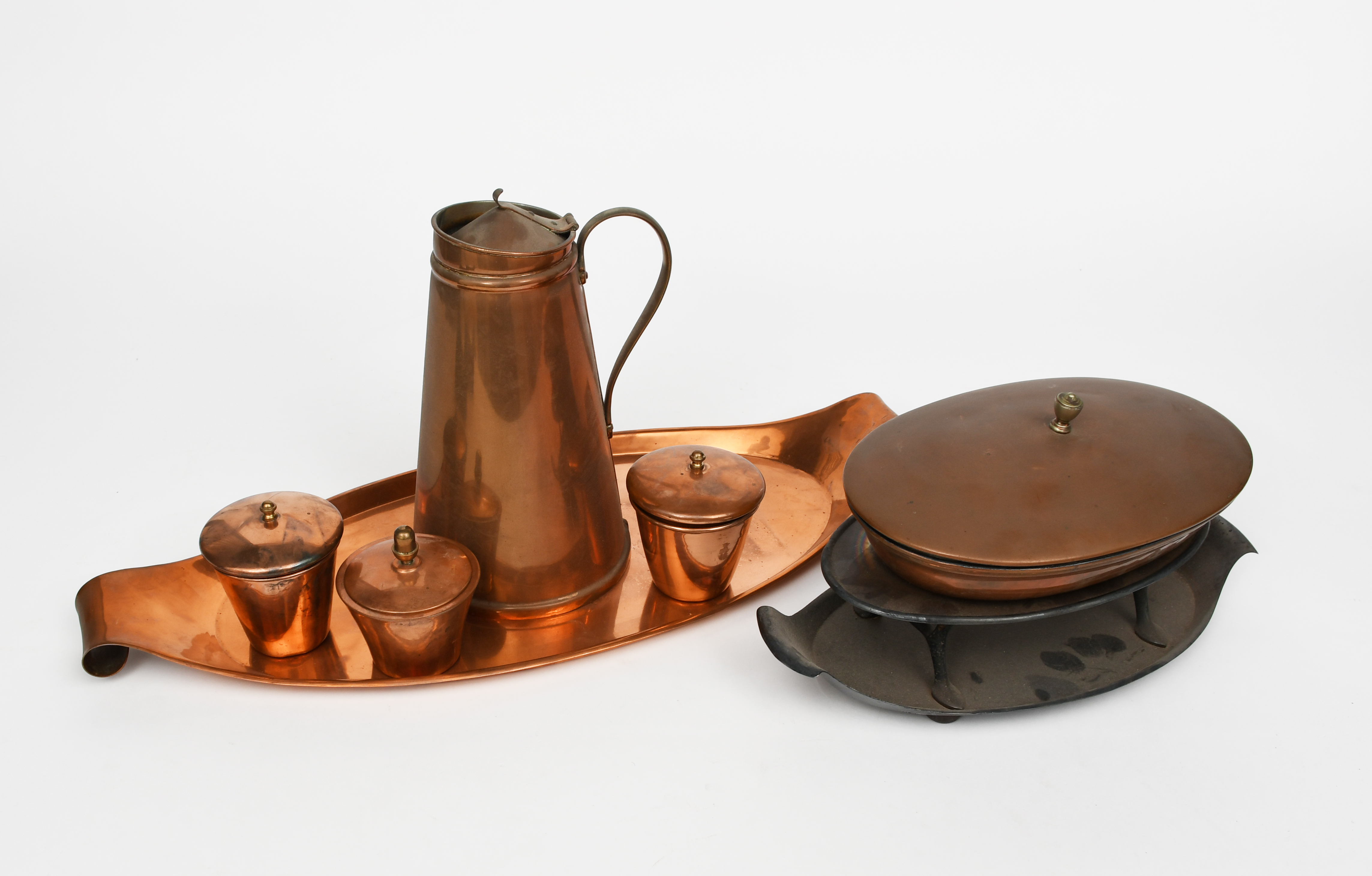A W A S Benson copper and brass tureen and cover on stand, elliptical with slightly domed cover on twin-handled tray, on ebonised wood feet, a WAS Benson vacuum flask, a WAS Benson copper pot and cover and two similar, and a KSIA muffin dish and cover, stamped marks, 30cm. wide (12)