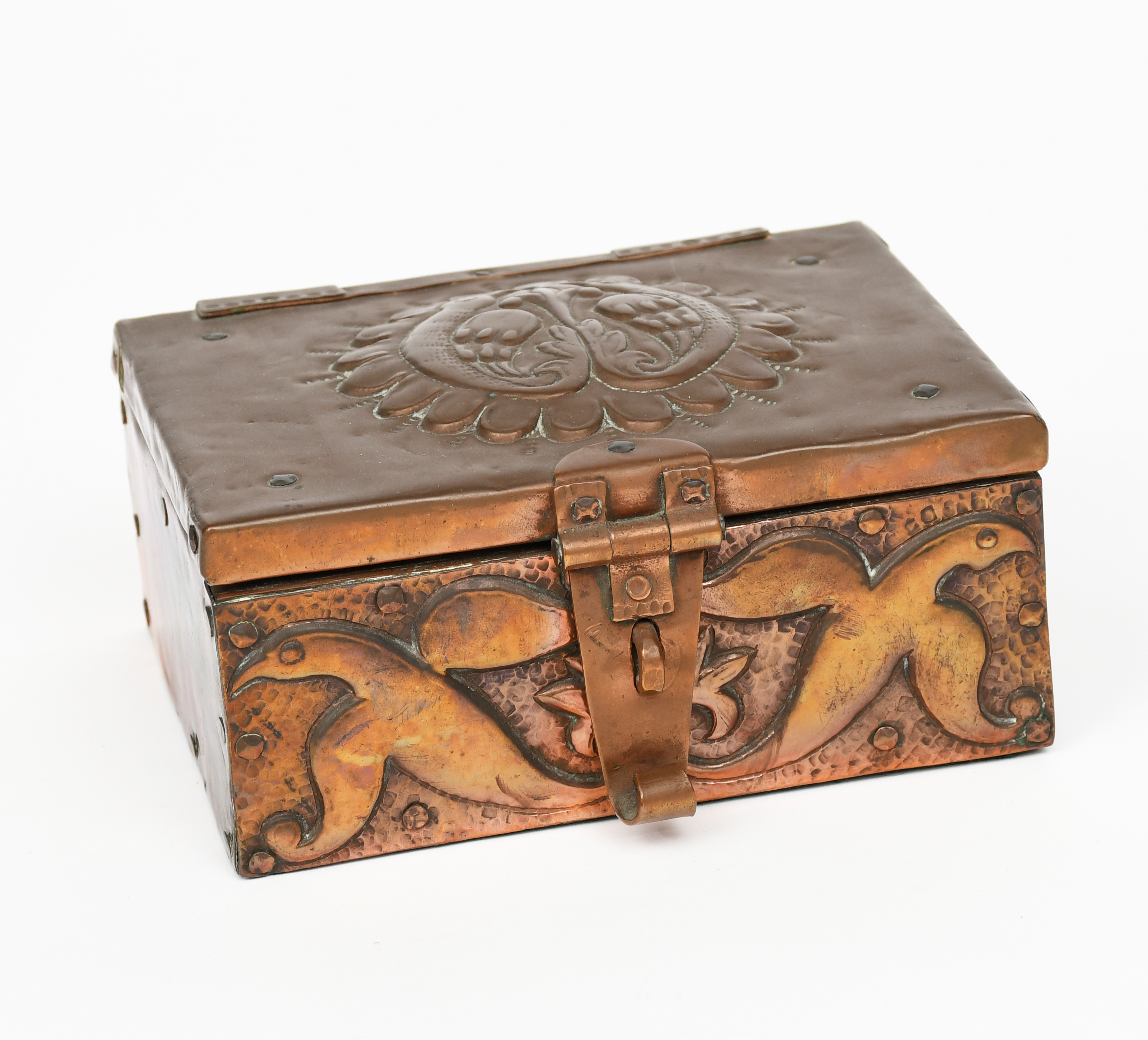 A John Pearson repousse copper casket, dated 1900, rectangular form, with hinged cover, the cover hammered in relief with two stylised birds forming a roundel, the front panel of the box hammered in relief with two stylised flying birds, punched JP monogram and 1900, 17 x 13cm.