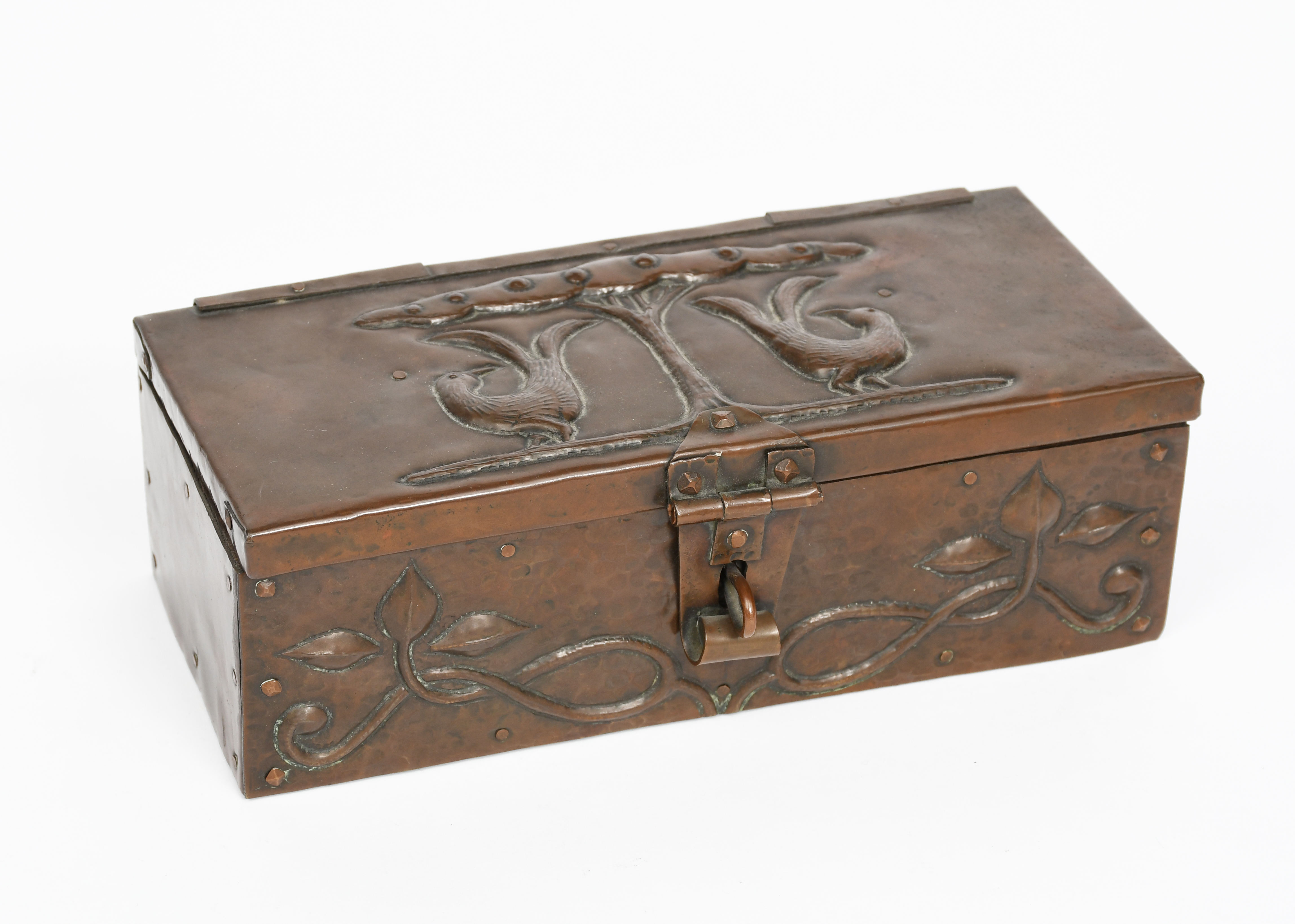 A John Pearson repousse copper box with hinged cover, dated 1904, rectangular, the cover hammered in relief with a pair of birds either side of a stylised tree, the front with scrolling foliage stems, cedar lined, hammered JP 1904, 23.5cm. wide.