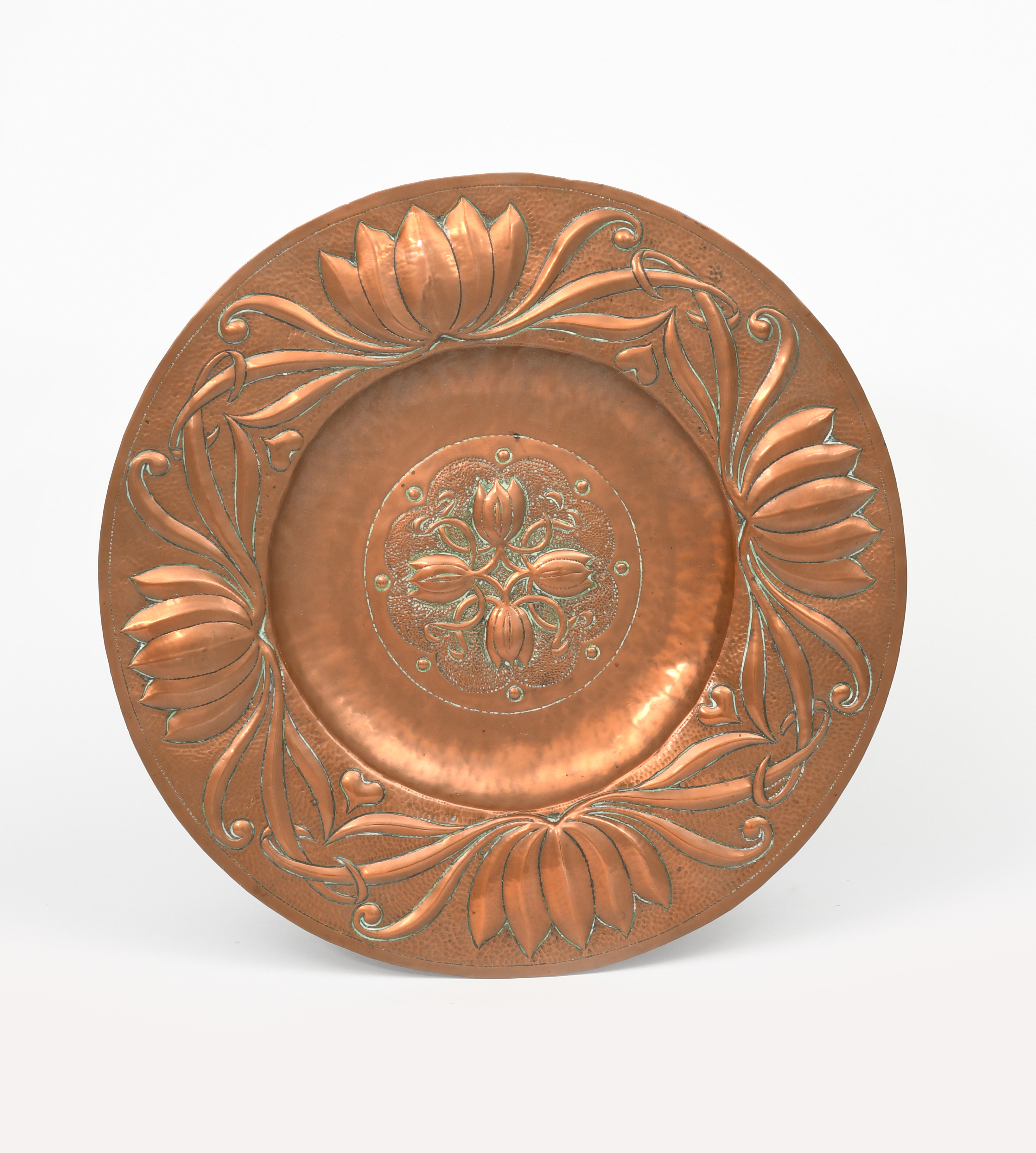 A repousse copper charger in the manner of John Pearson, possibly Guild of Handicrafts, hammered to the rim with a frieze of waterlily flowers and scrolling foliage, the well a roundel of similar flower buds and foliage, unsigned, 41cm. diam.