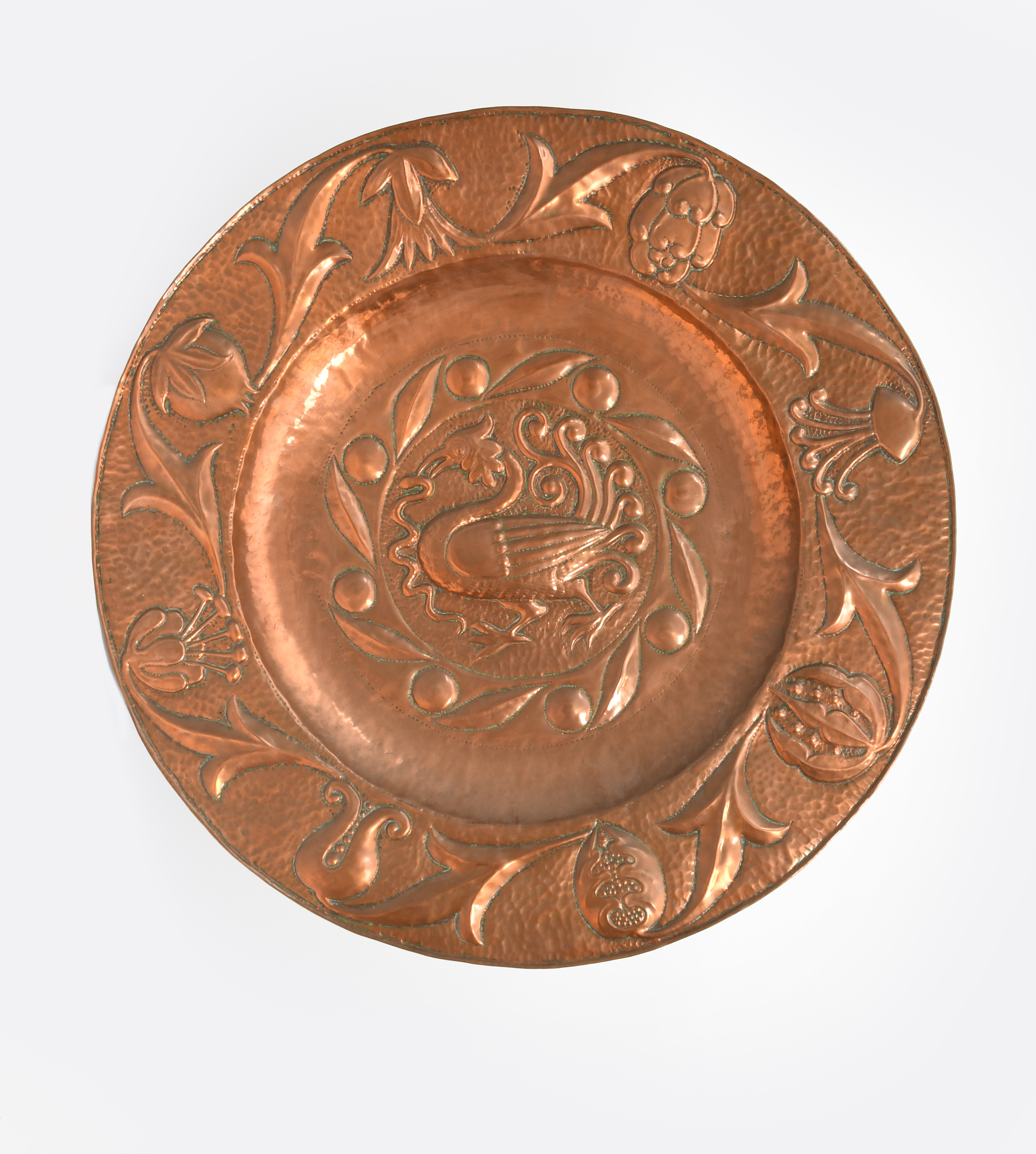 A John Pearson repousse copper wall charger, dated 1903, hammered in low relief with a bird with a snake in its beak to the well, inside a simple laurel leaf and berry border, the rim with a broader band of stylised flowers and foliage, incised JP 1903 and 3064 number, 51cm. diam.