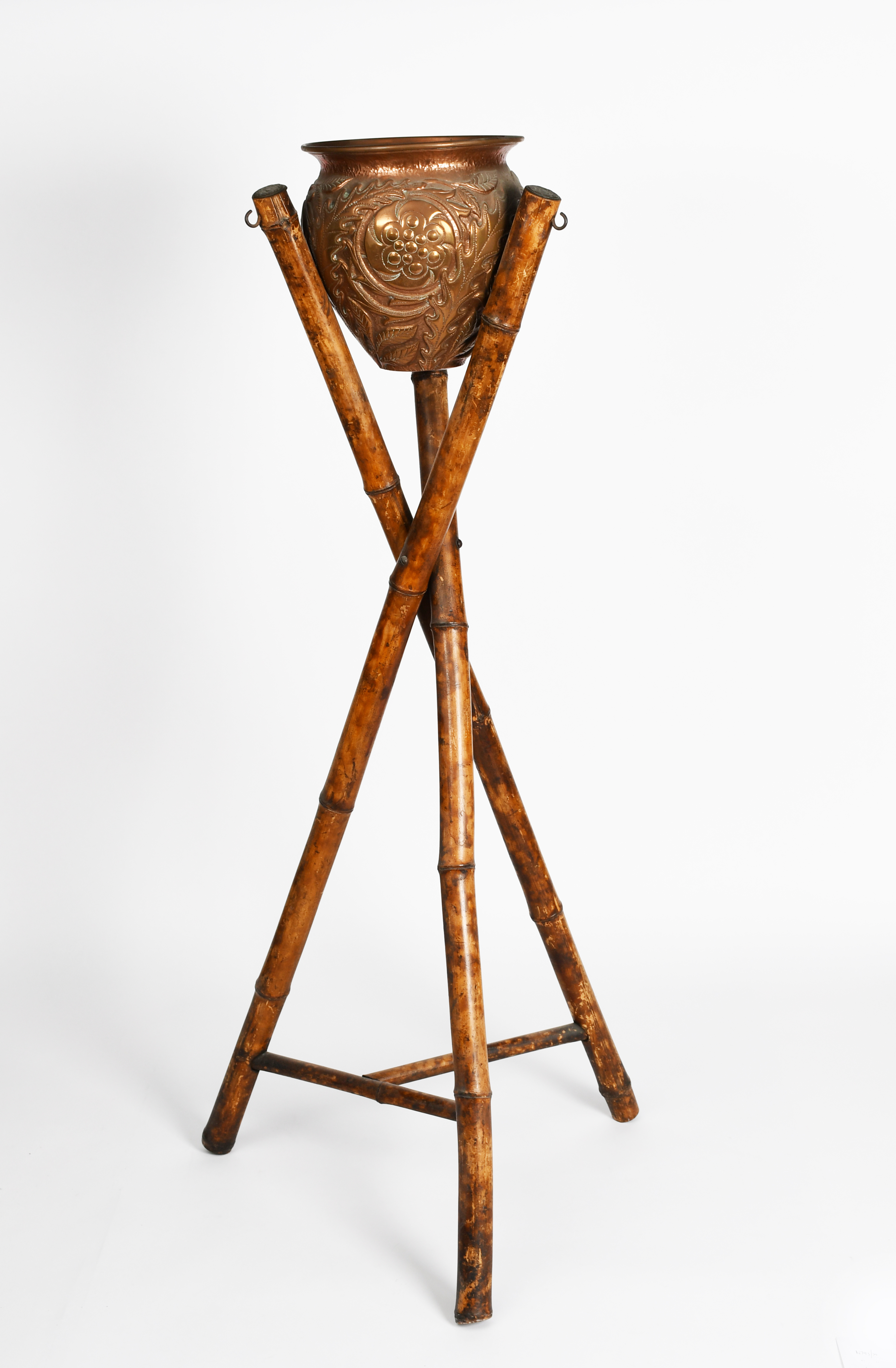 A John Pearson repousse copper jardiniere, dated 1892, shouldered form with everted top rim, hammered in relief with stylised flowers and foliage panels, with bamboo tripod stand with metal caps, hammered JPearson 1892 and numbered 574, 22cm. high, 112cm. high (on stand), (2)