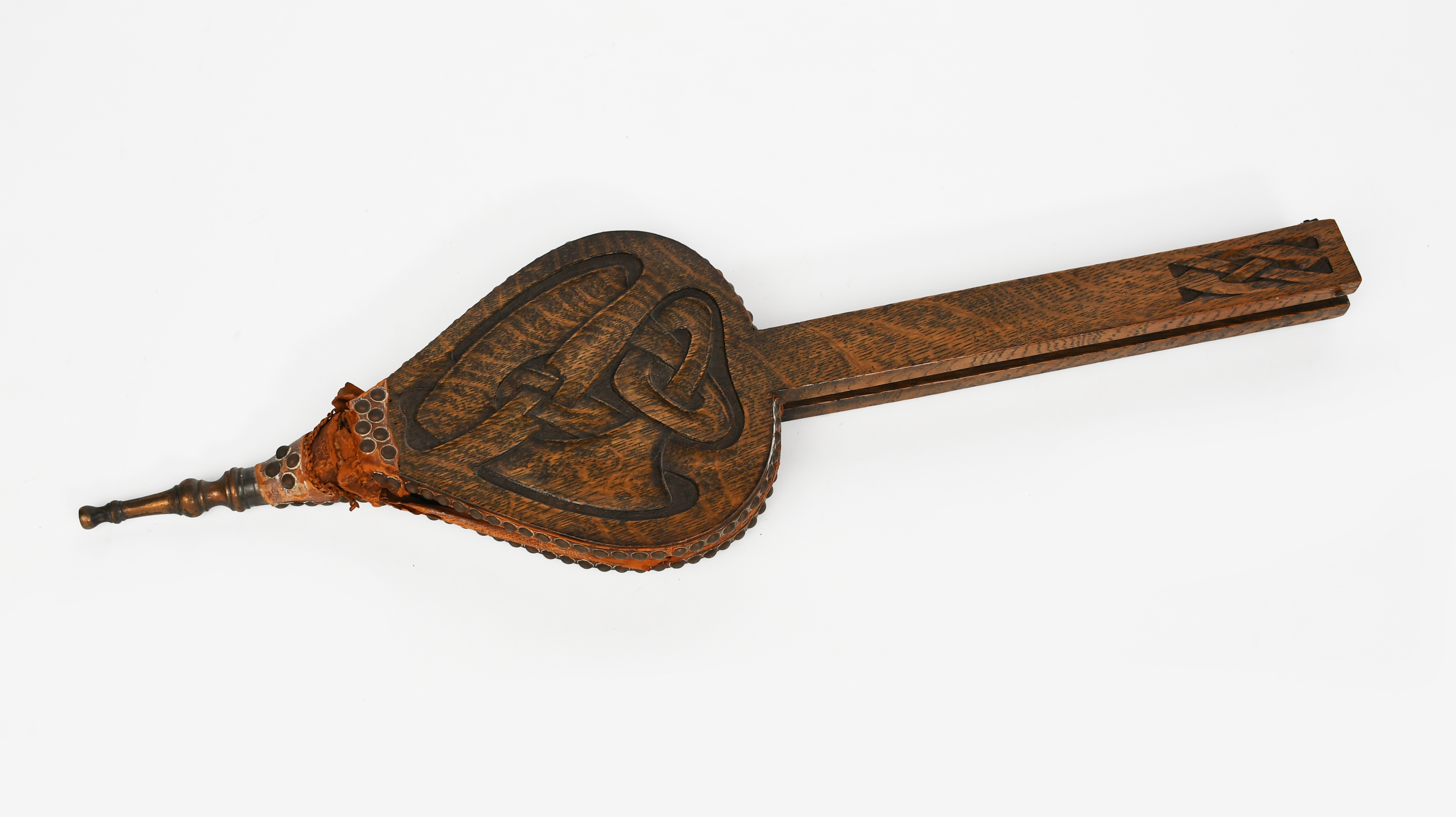 A pair of Liberty Otley oak bellows, the heart shaped panels carved with Celtic knot design, unsigned, 75cm. long