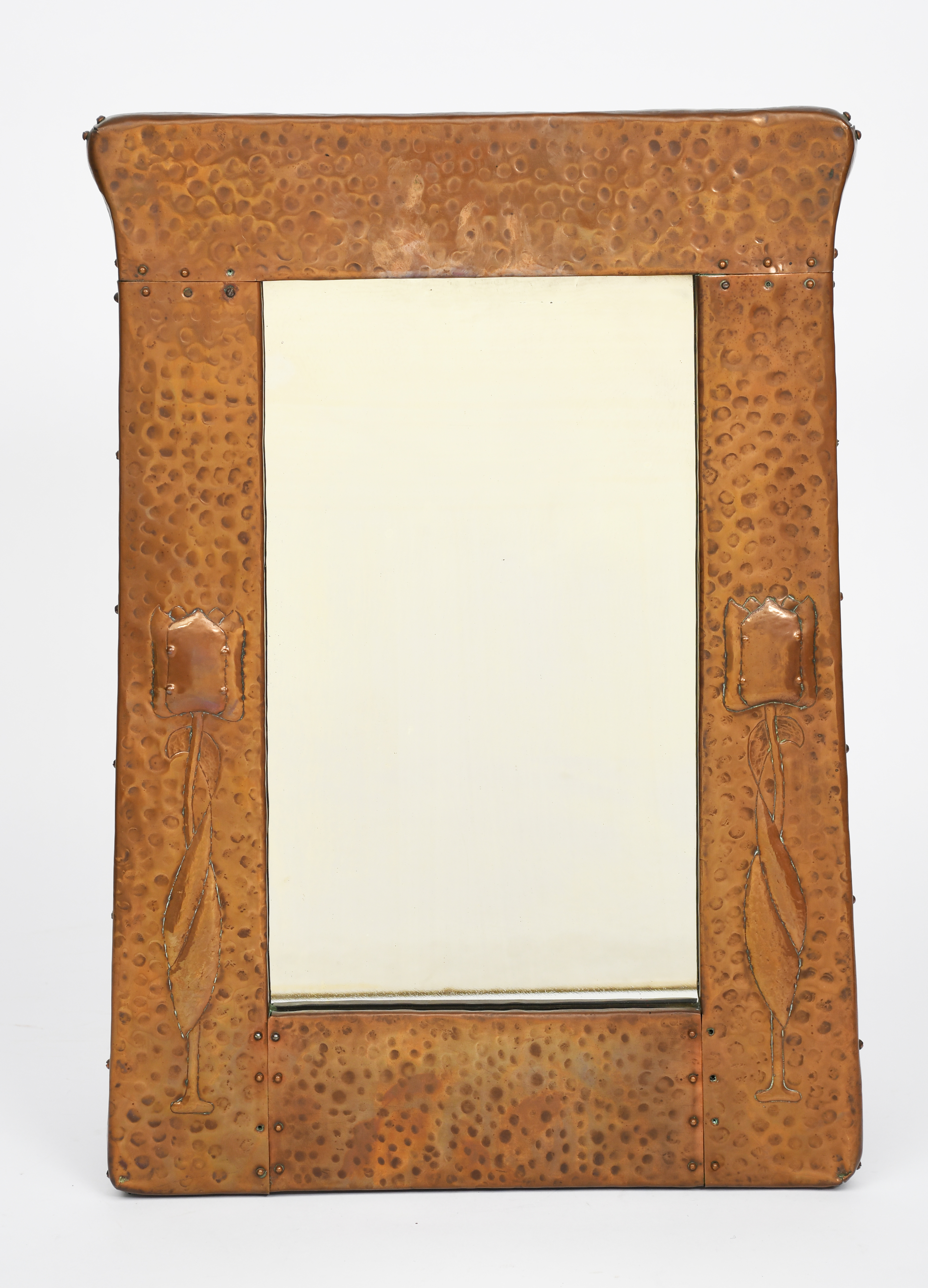 A Liberty & Co hammered copper wall mirror, tapering rectangular form, stamped in relief with Art Nouveau tulip stems to each side, unsigned, 53 x 36.5cm.