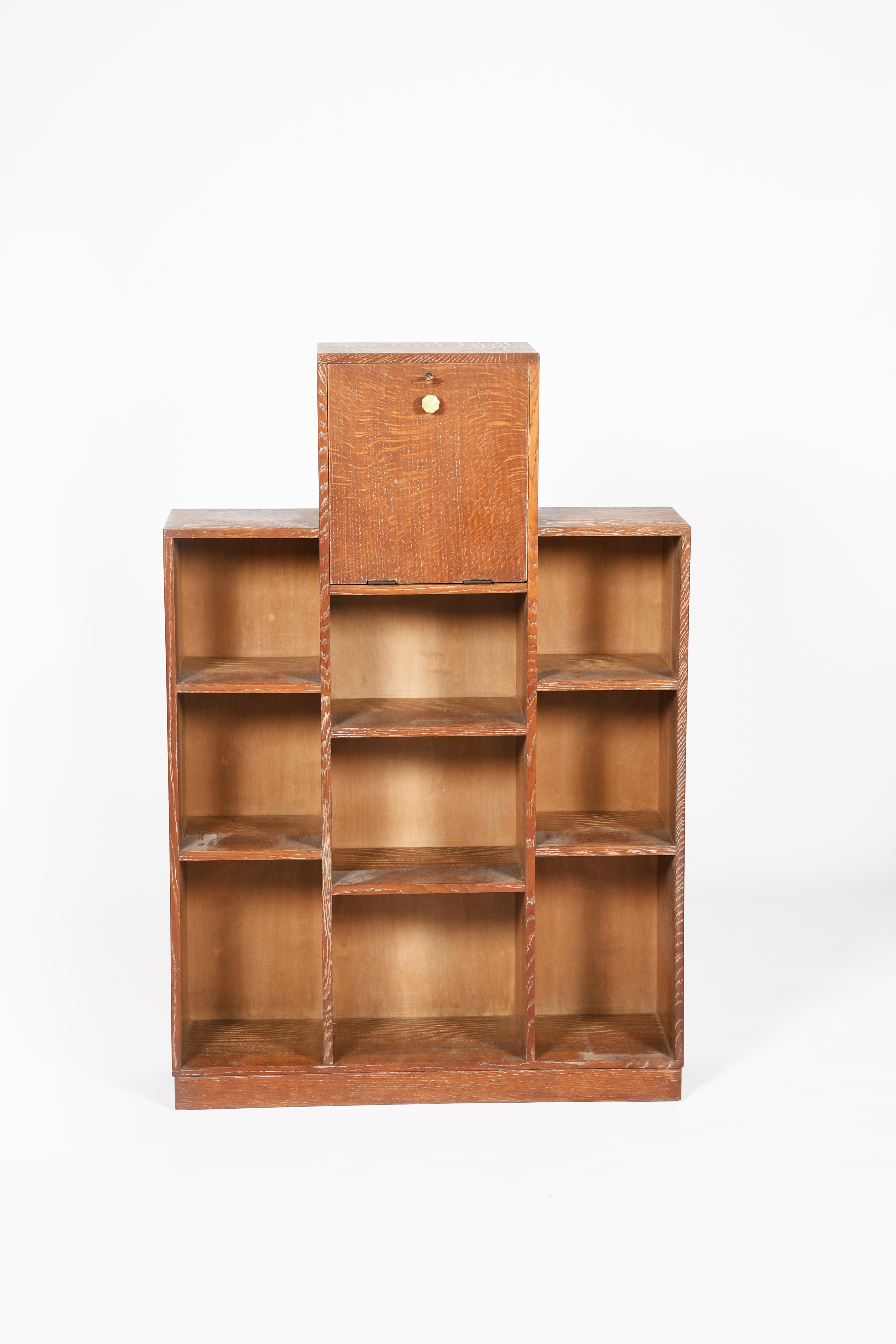 An Art Deco limed oak bookcase, three stepped banks of shelves with a hinged, drop down compartment, with green bakelite handle, unsigned, 109cm. high, 73cm. wide