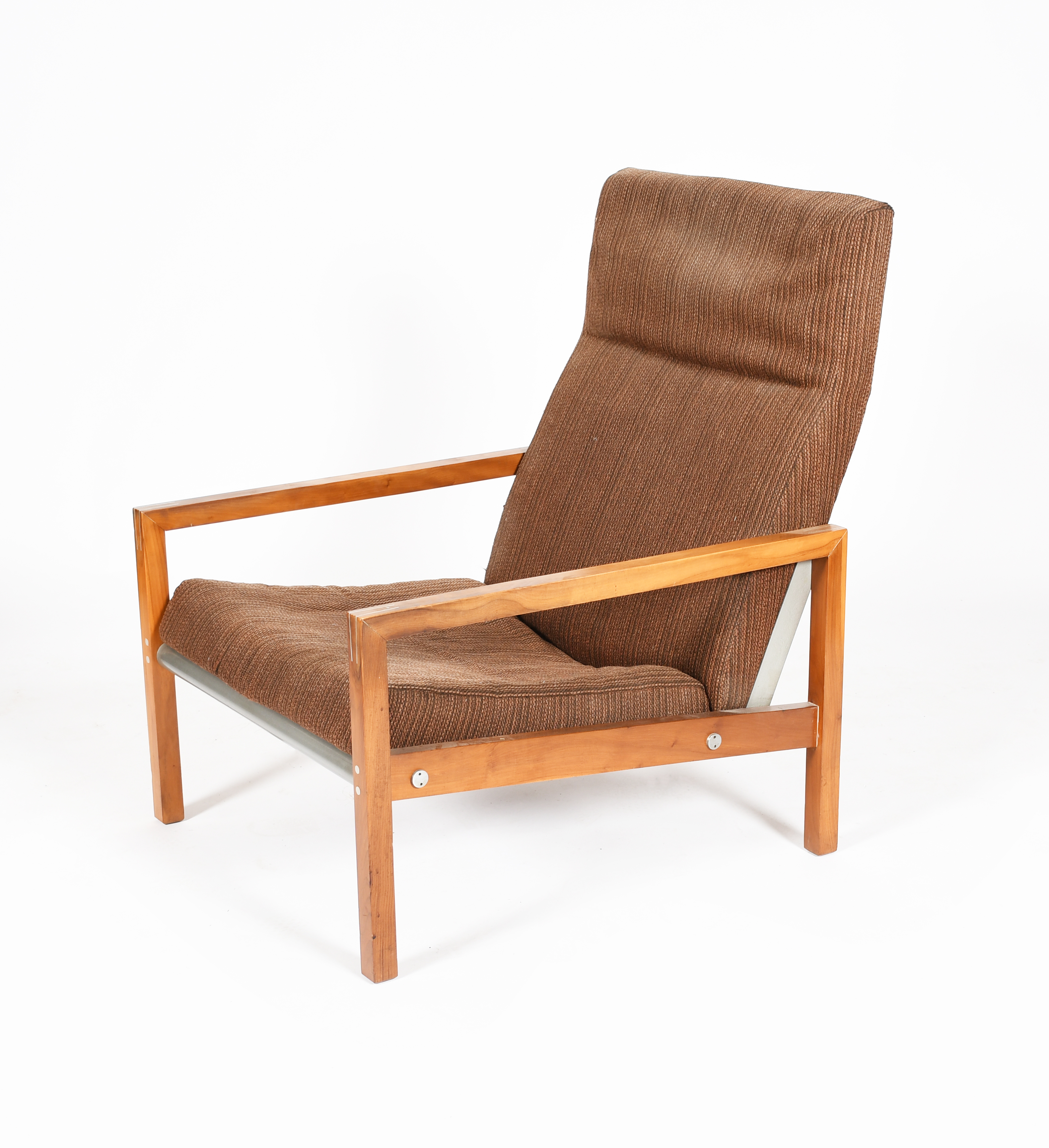 A Race Furniture Sheppey chair designed by Ernest Race, ash frame with stove-enamelled steel, and a pair of ebonised wood ladderback chairs in the manner of Gio Ponti, possibly retailed by Liberty & Co, unsigned, 85cm. high (Sheppey Chair), 84cm. high,(ebonised chair), (3)