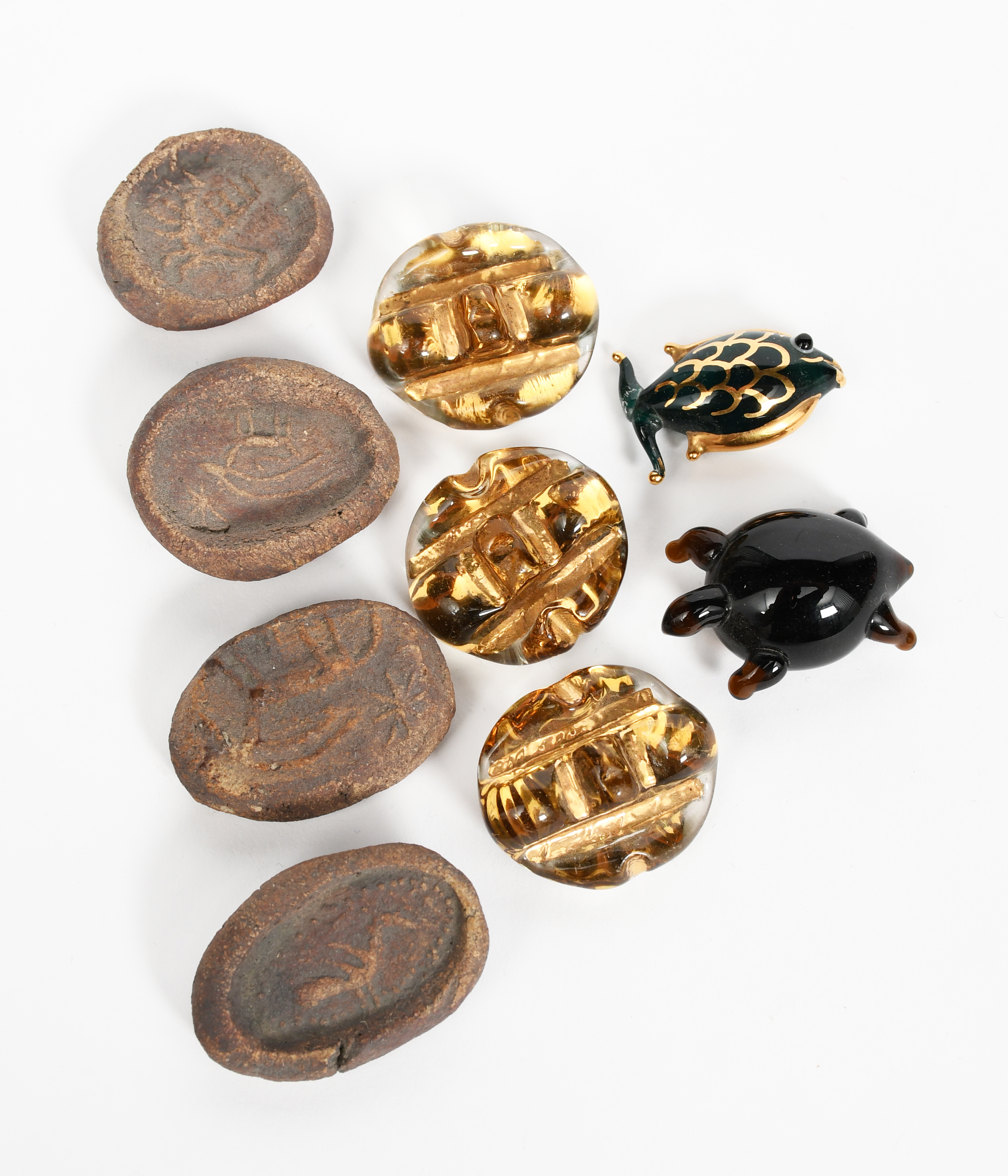 A set of three glass buttons, oval with cast decoration and gold highlights, with brass mount, a glass tortoise and a fish, and four ceramic roundels each cast in low relief with a creature, glass buttons stamped with Bimini factory mark, 3.3cm. wide (glass buttons), (9)
