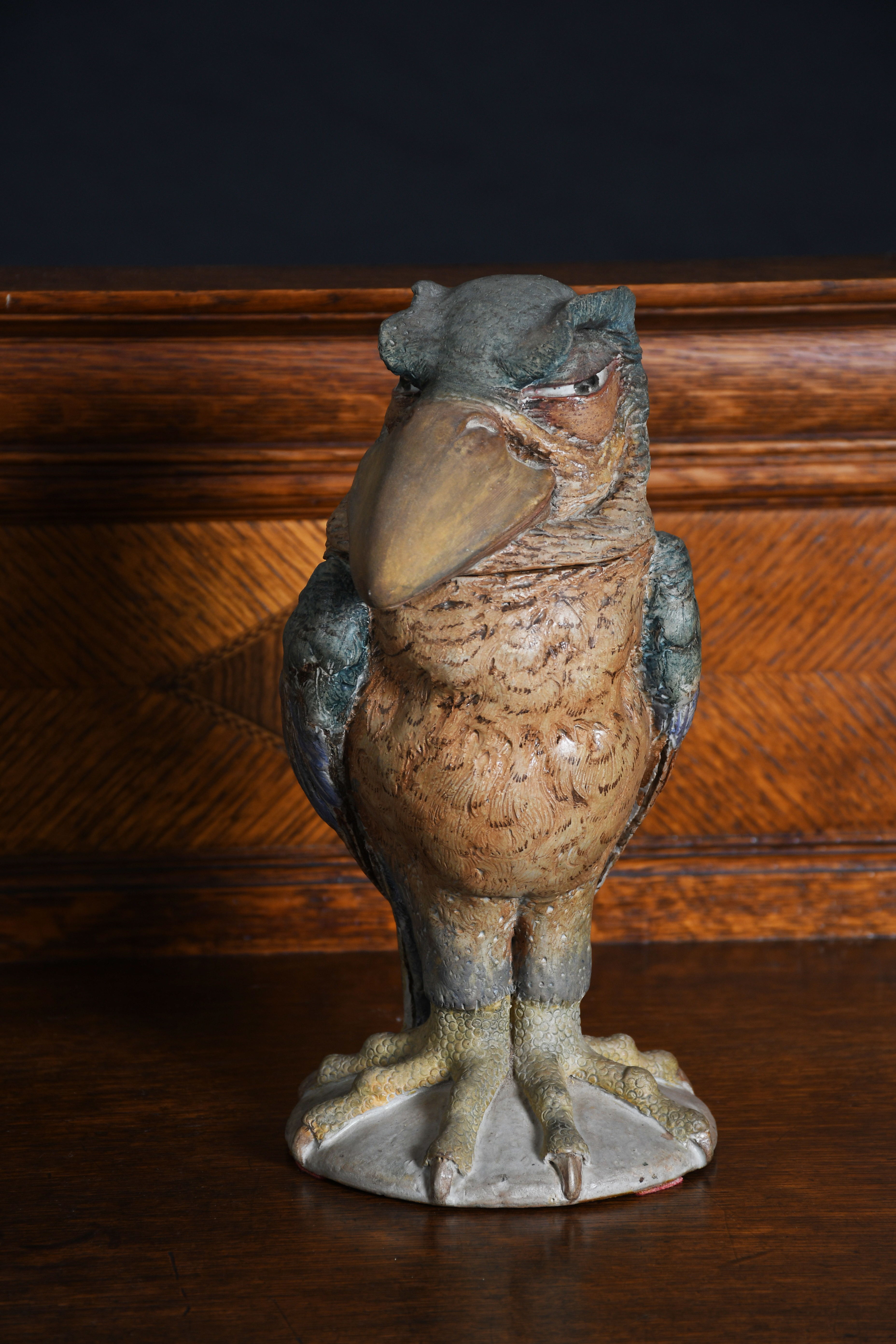 A Martin Brothers stoneware bird jar and cover by Robert Wallace Martin, dated 1890, modelled standing, with large claw feet the talons clutching the domed base, with broad beak and forward stare, painted in matt green and brown with white and blue highlights, painted 1890 Martin Bros London & Southall to base, 25cm. high, (2)