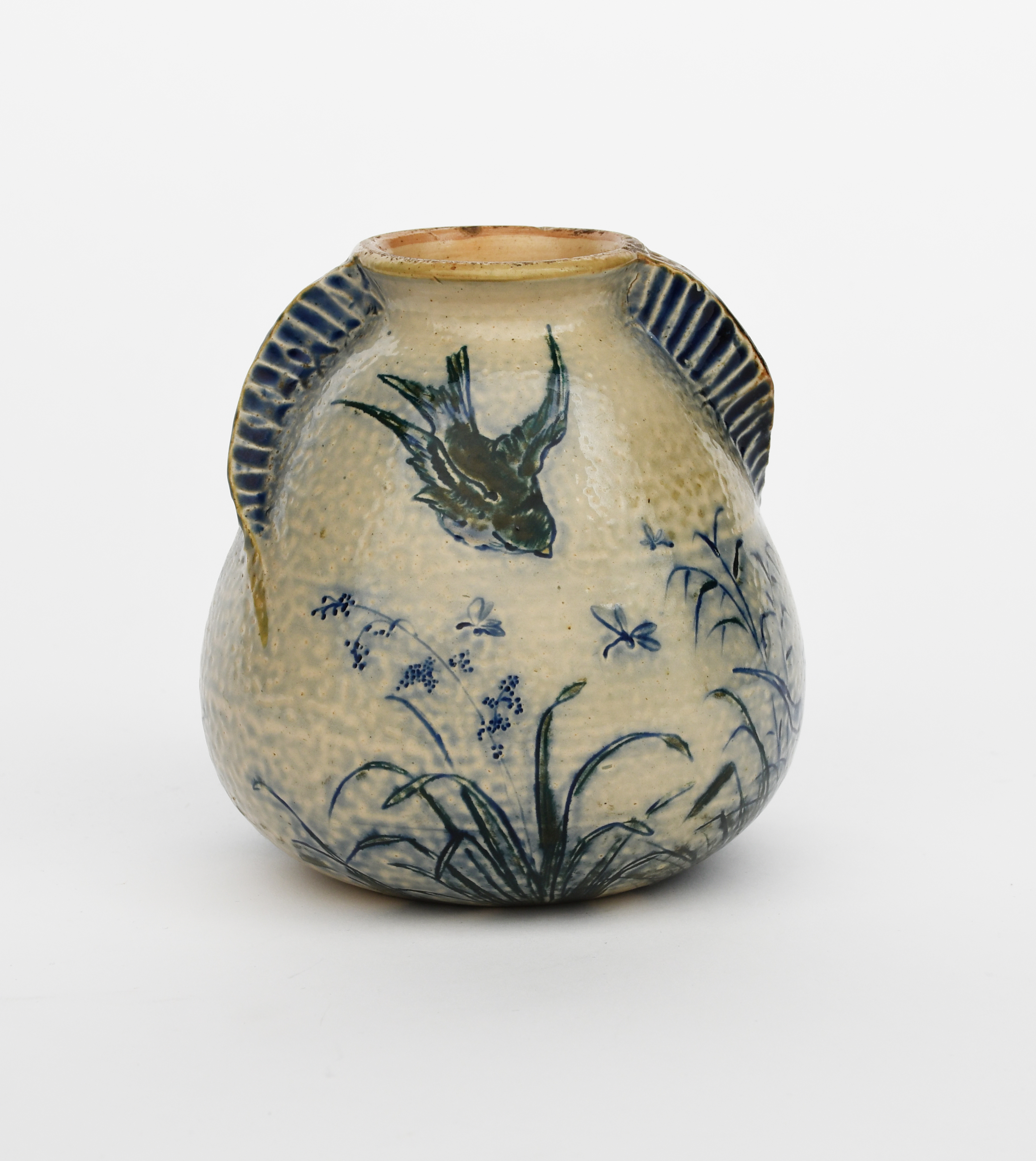 A Martin Brothers stoneware vase by Edwin & Walter Martin, dated 1882, tapering form with applied fin handles, incised and painted with a martin bird flying past grasses, in green and blue on a buff ground, incised 12.5.82 Martin London, applied Harriman Judd and W&W auction labels 12.5cm. high