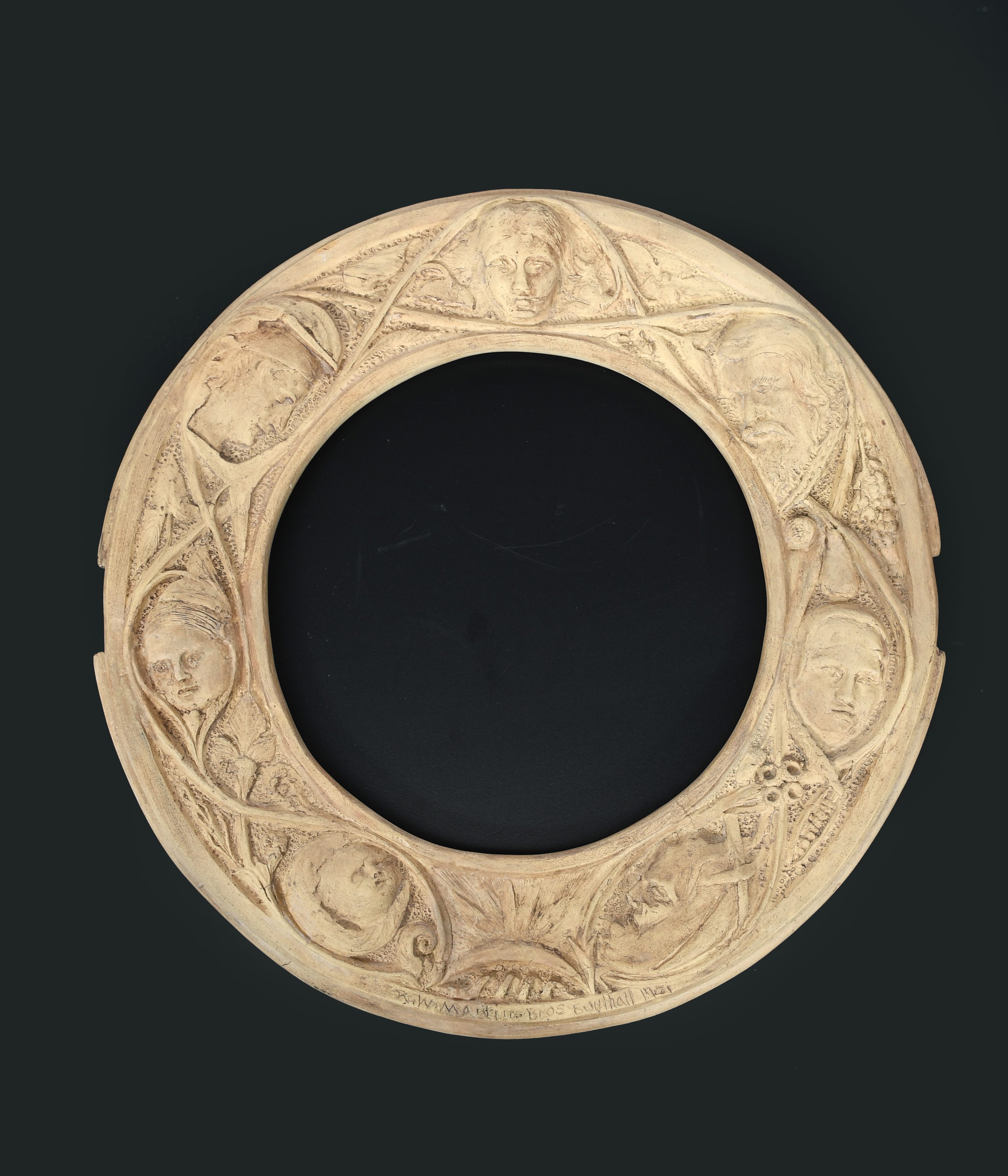 Seven Ages of Man a rare Martin Brothers stoneware frame by Robert Wallace Martin, dated 1901, circular modelled in low relief with seven portraits of man from new born baby to old age, incised R W Martin & Bros, Southall to rim, the reverse incised R W Martin Bros 3-1901, Southall, professional restoration, 27cm. diam.