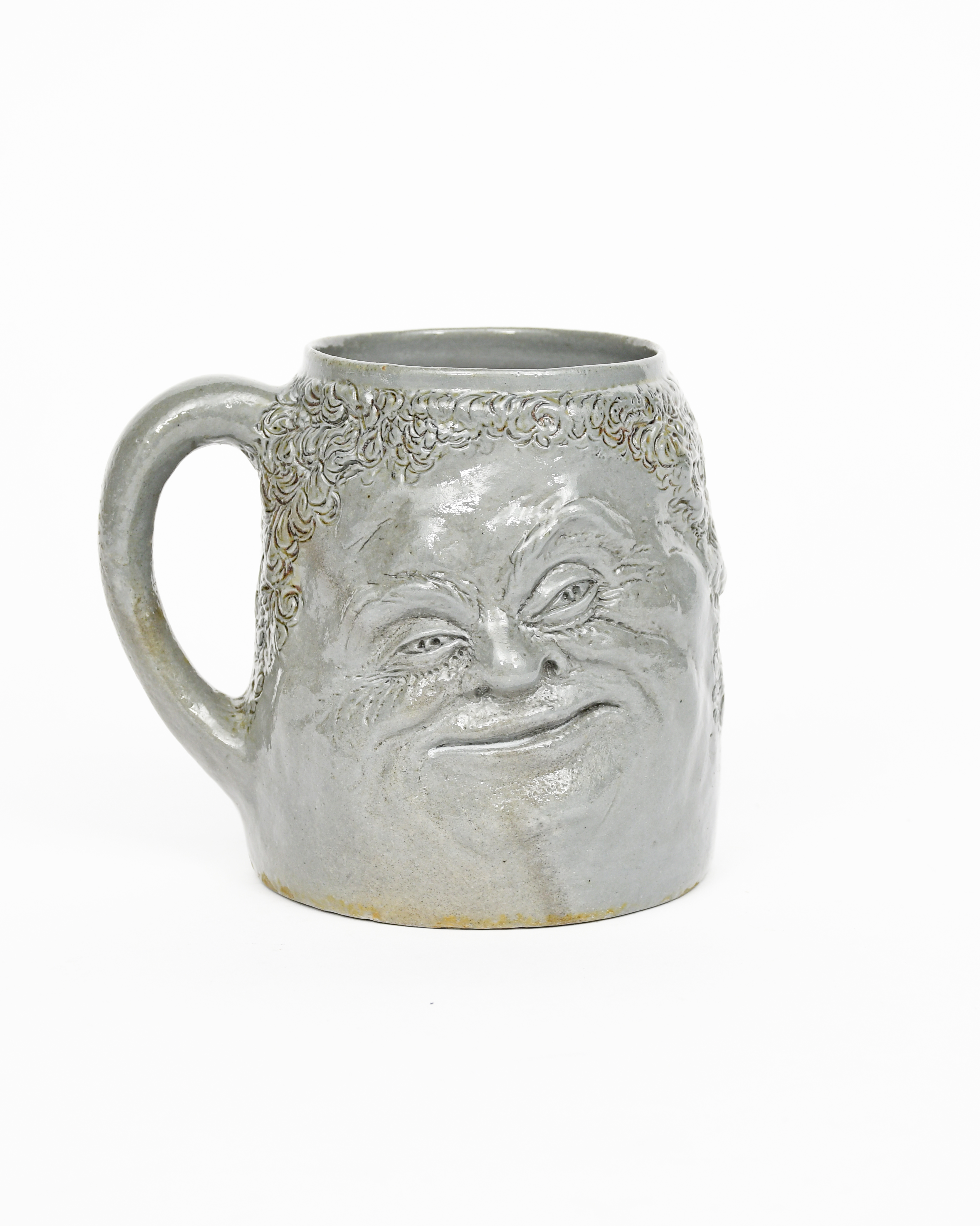 A Martin Brothers stoneware face jug, cylindrical, modelled in low relief to both sides with a smiling face, covered in a grey glaze, incised R W Martin & Bros London & Southall, 12cm. high