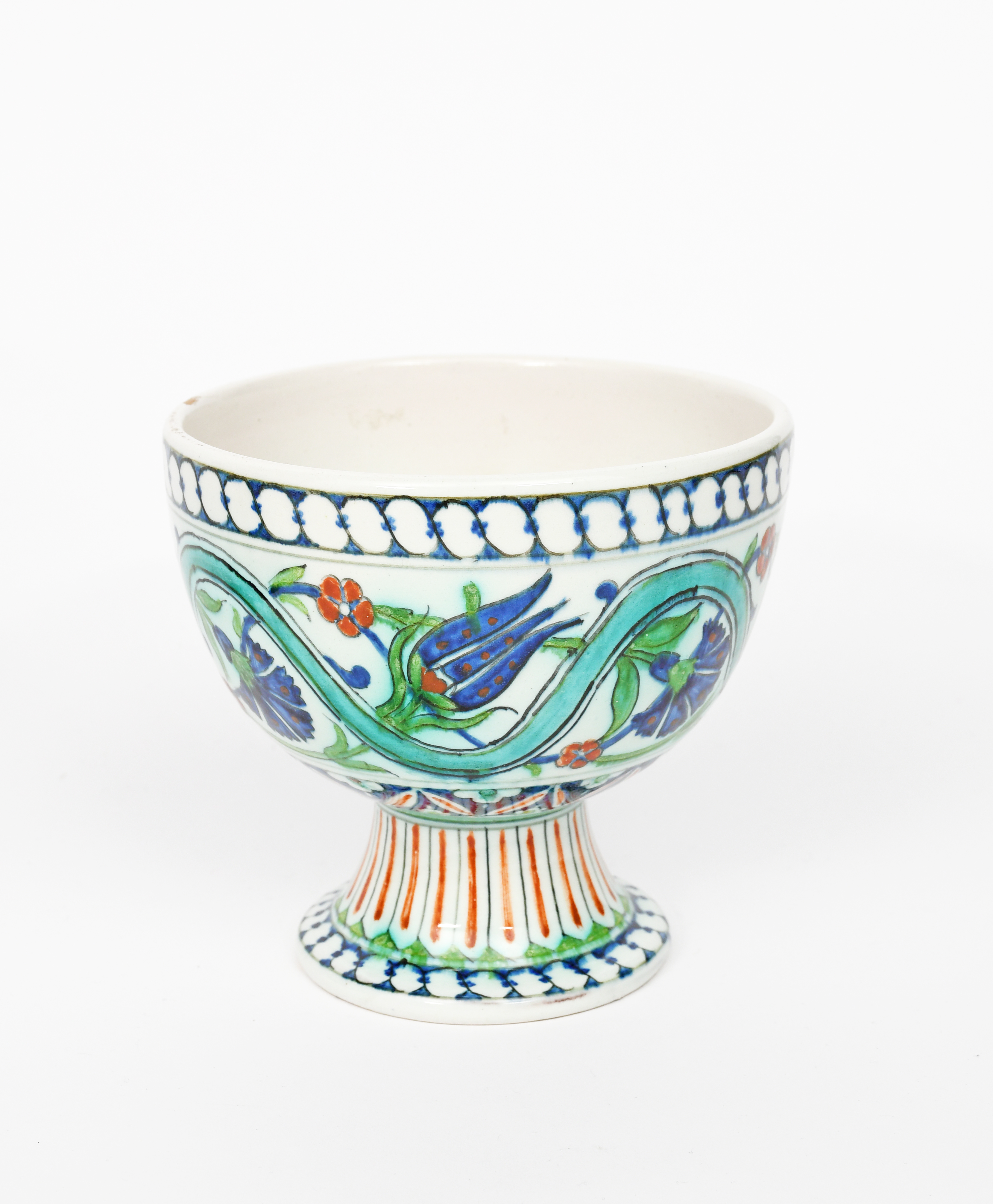 A Cantagalli Persian small pedestal bowl, painted with a band of scrolling carnation, in shades of blue, turquoise, green and red on a white ground, painted Cantagalli mark, small glaze chip to top rim, 12cm. high, 13cm diam.