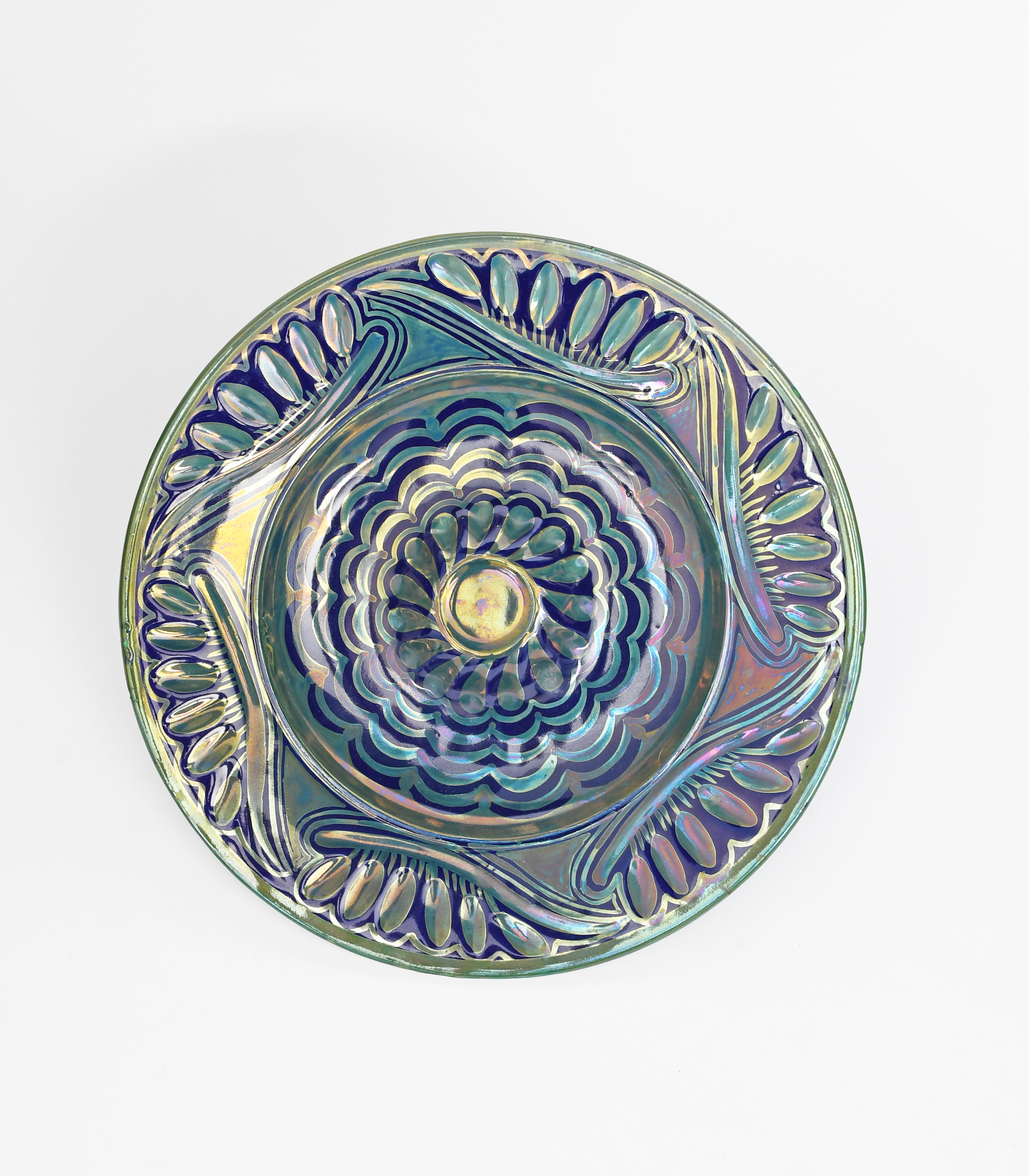 A pottery Hispano-Moresque charger probably Cantagalli, circular with raised well, modelled in low relief and painted with stylised flower forms in silver lustre on a blue lustre ground, unsigned, 37cm. diam.