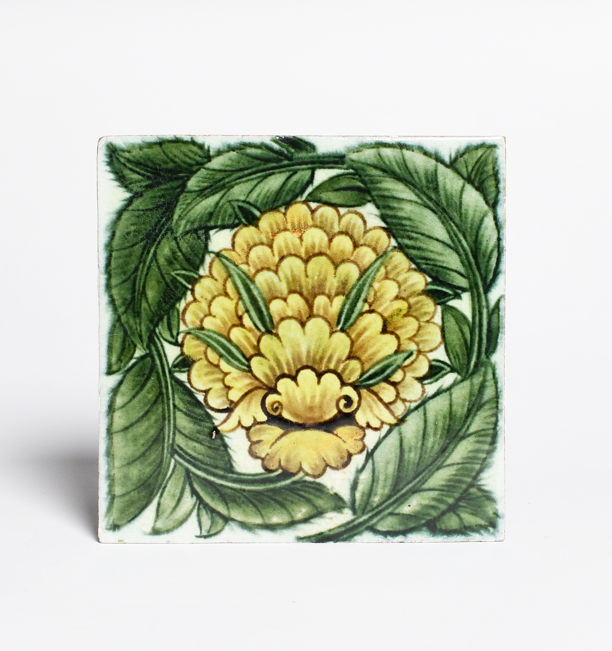 A William De Morgan Late Fulham Period tile, painted with a flower in yellow and green on a white ground, impressed factory marks, 15.5cm. square