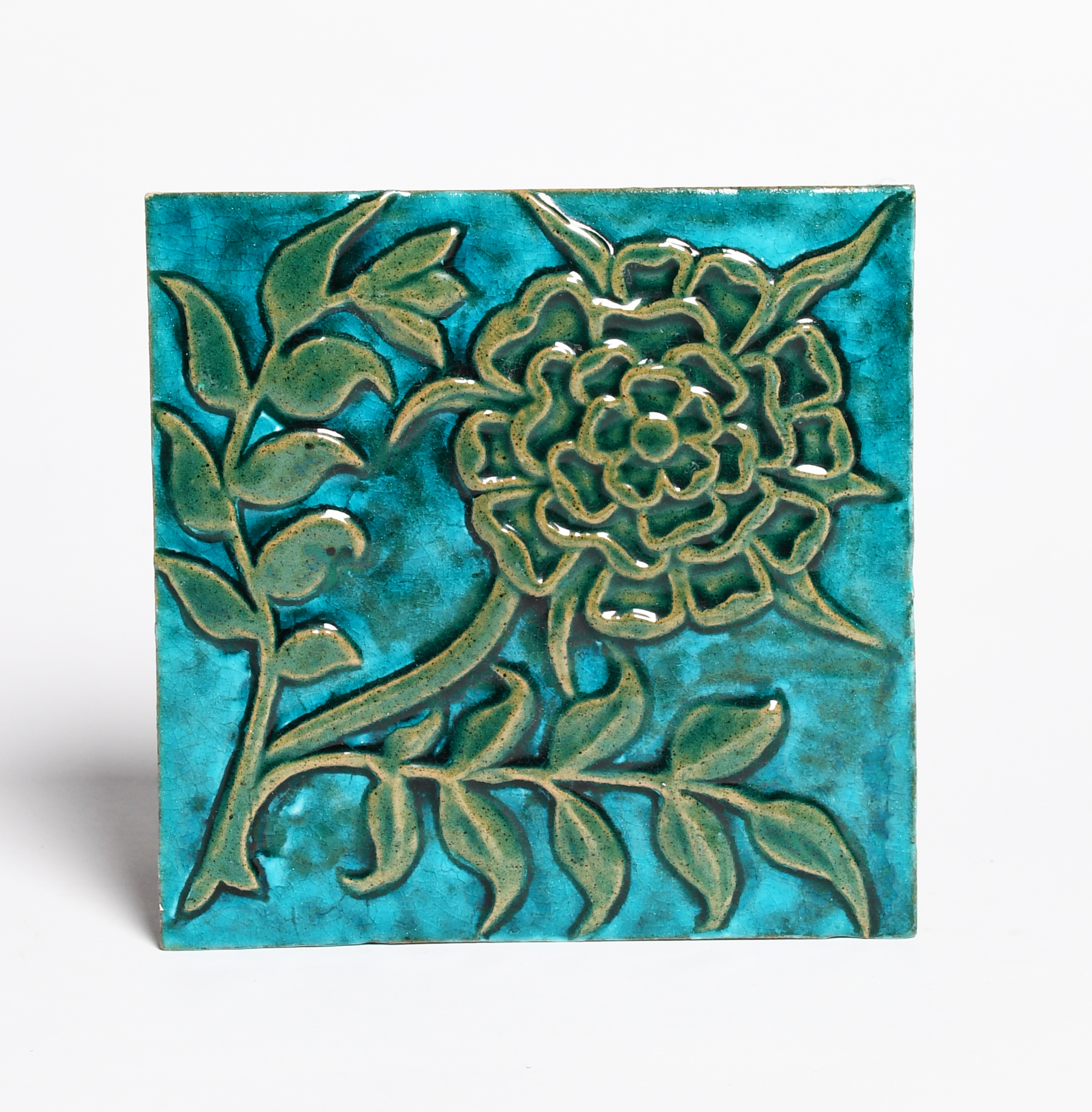 A William De Morgan Sands End Pottery Four Inch Rose tile the design attributed to Halsey Ricardo, moulded in low relief, painted in green on a blue ground impressed factory marks, 15.3cm. square