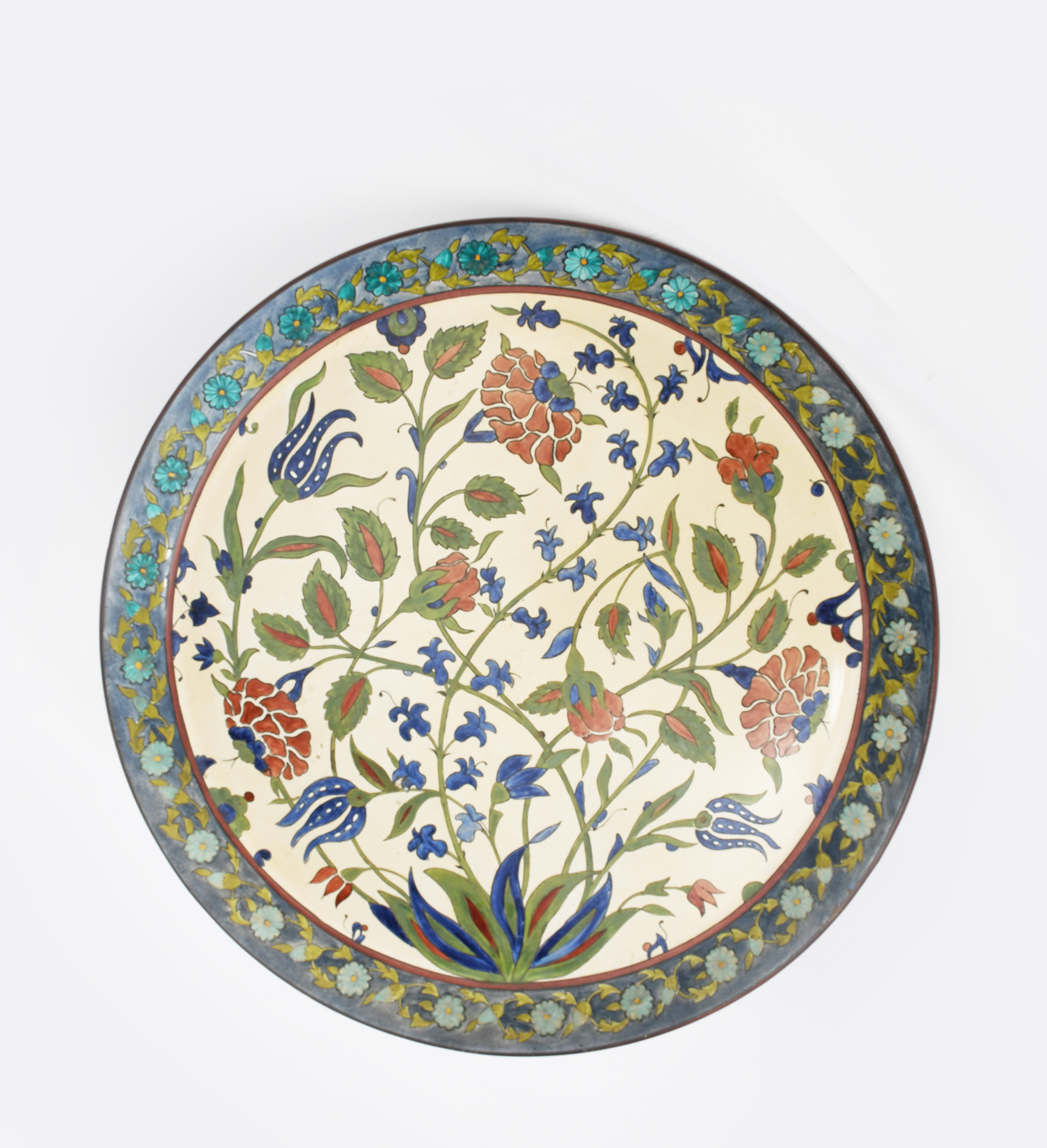 A large Iznik wall charger, flat with shallow raised rim, painted with stylised Persian flowers in shades of blue, red and green inside a band of turquoise flowerheads to the rim, impressed factory marks, painted artist monogram, 51.5cm. diam.