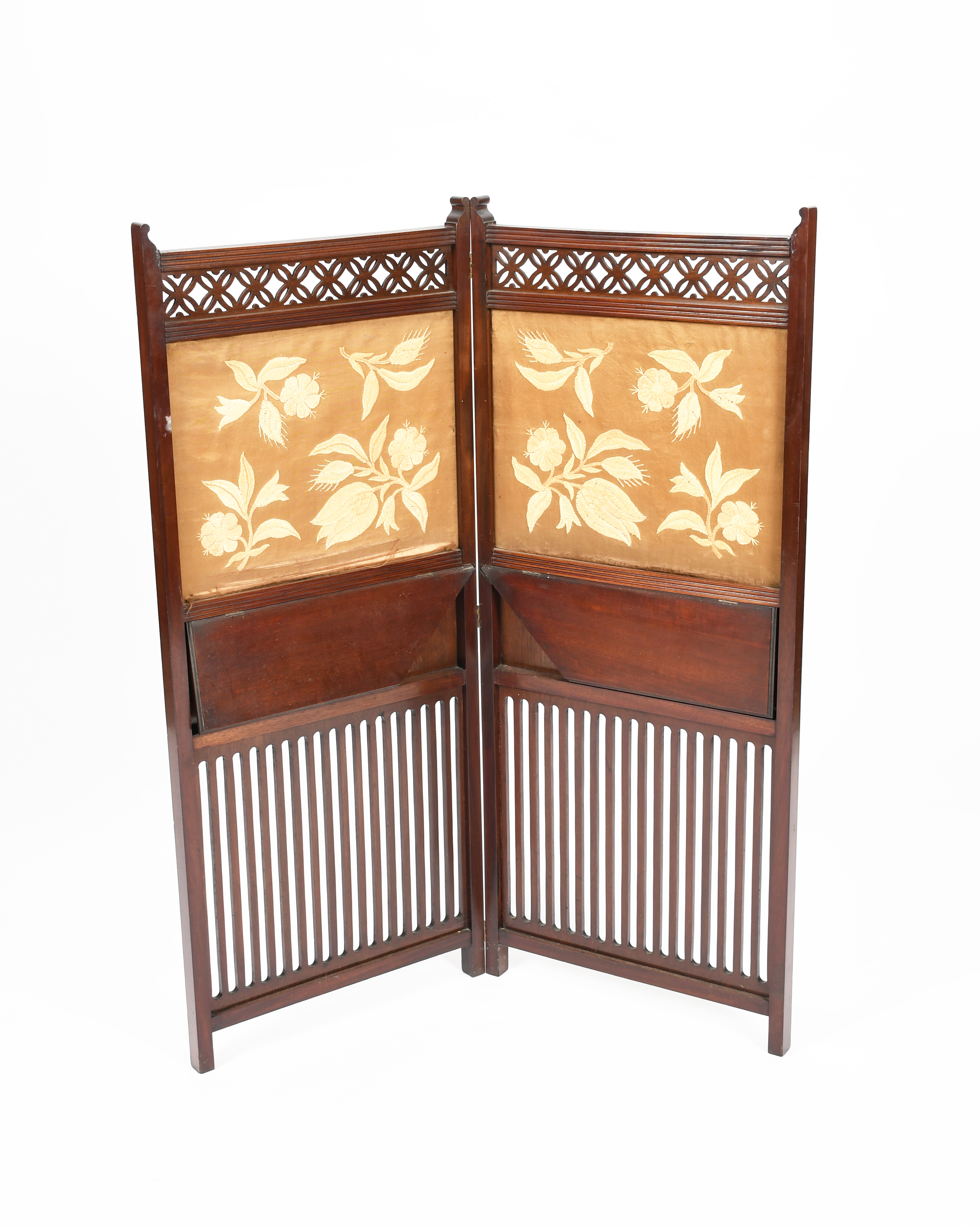 An Aesthetic Movement mahogany two-fold screen, with pierced rails and two hinged shelves, set with embroidered silk panels of flowers and foliage unsigned 109.5cm. high, 90cm wide