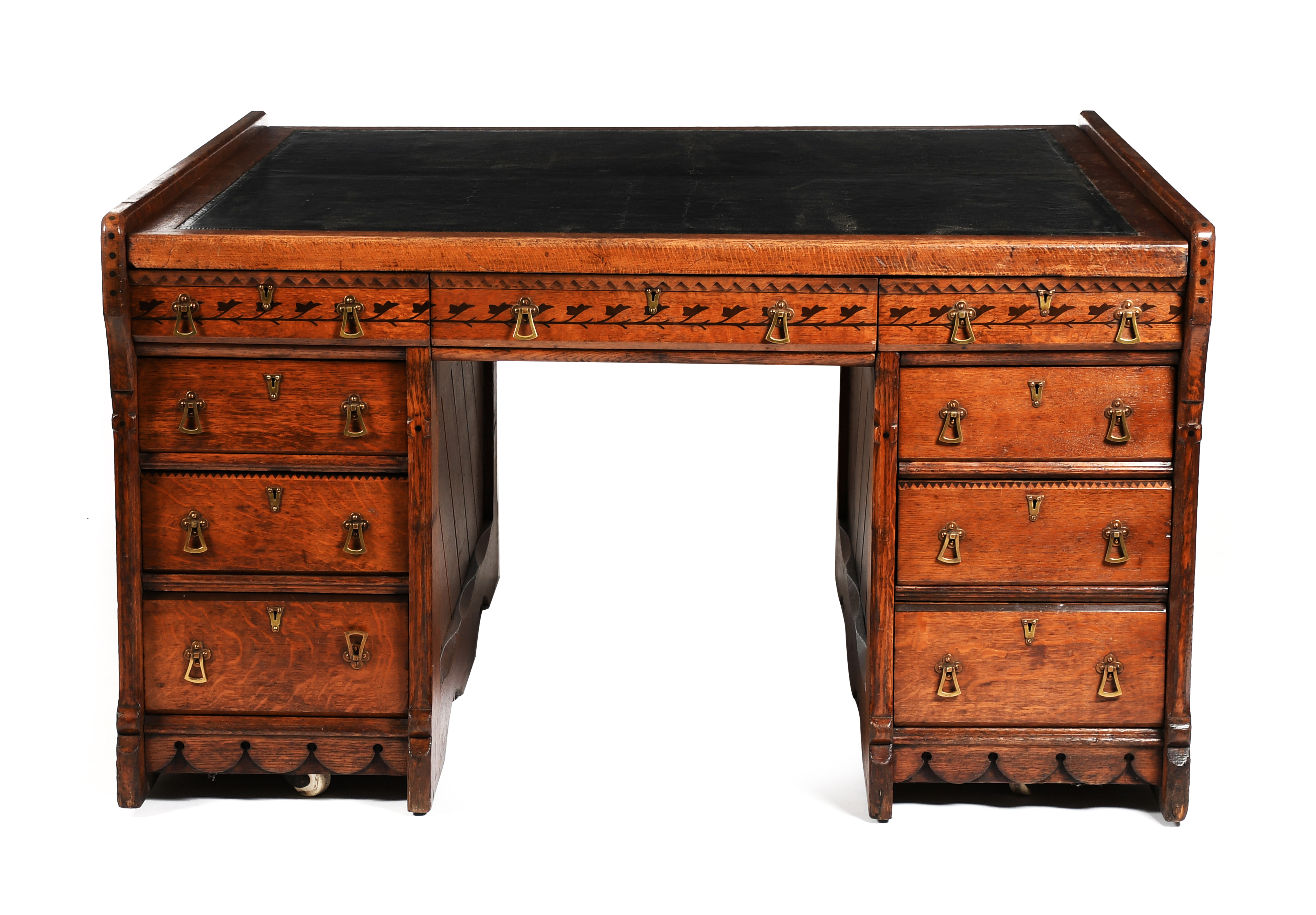 An oak partners desk the design attributed to John Pollard Seddon, rectangular top inlaid with leather, over three drawers, on two bands of three graduated drawers, panelled sides, with polished brass furniture, unsigned,