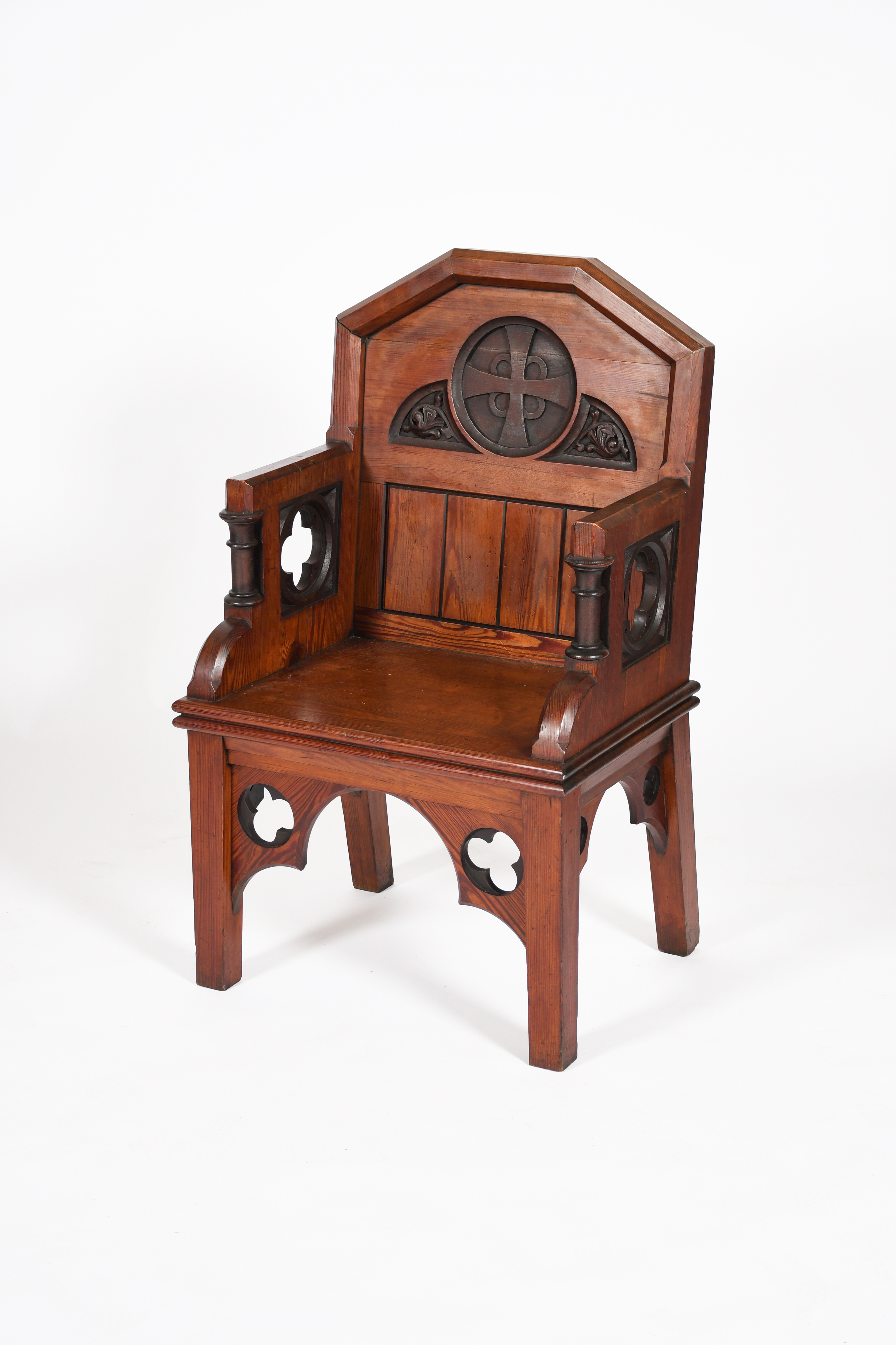 A Cox & Sons throne chair the design attributed to William Butterfield, probably manufactured by Messrs Cox & Son, architectural form, the planked back set with carved roundel panel, the arms pierced with a ogee panel and ionic pillar fronts,arched tracery under-carriage with similar trefoil roundels, with staining to details, unsigned, 105cm. high