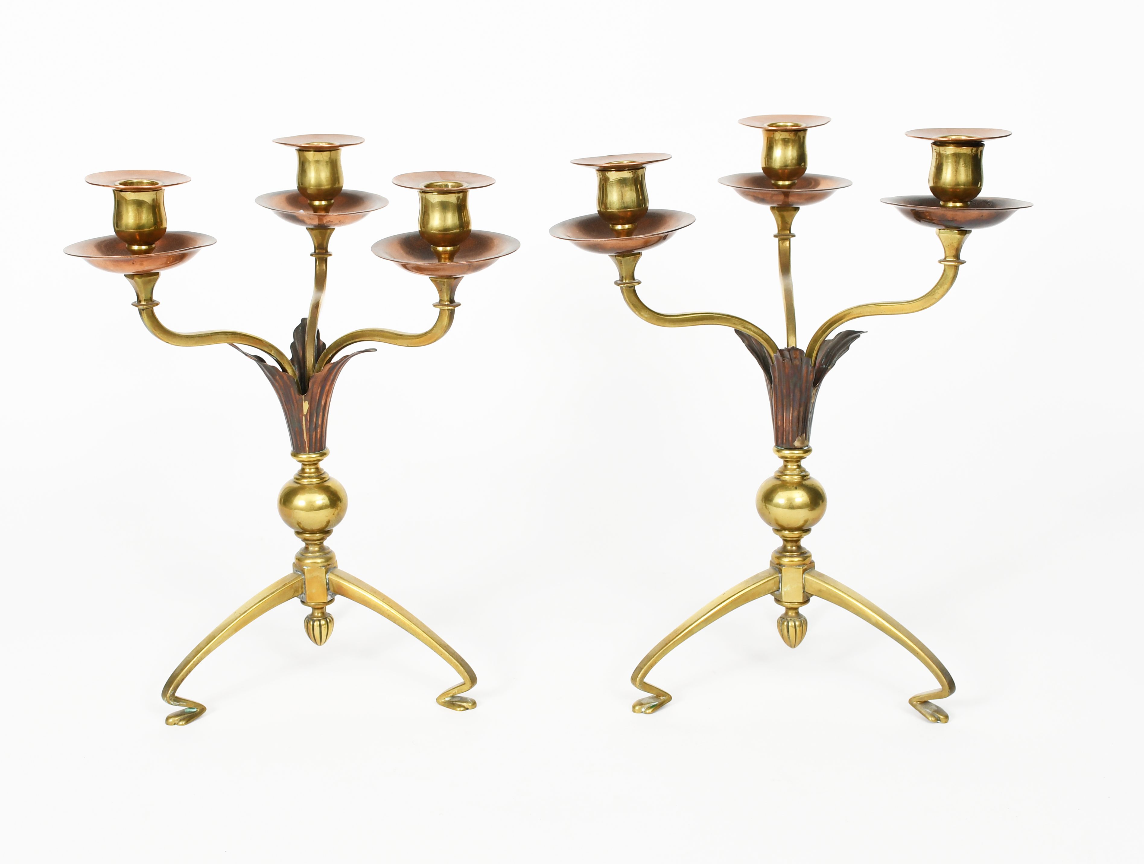 A pair of WAS Benson copper and brass three-light candlesticks, model no.22A, on angled tripod feet, knopped stem with copper foliate decoration, flaring three branch neck with sconces, unsigned, 34.5cm. high, (2)