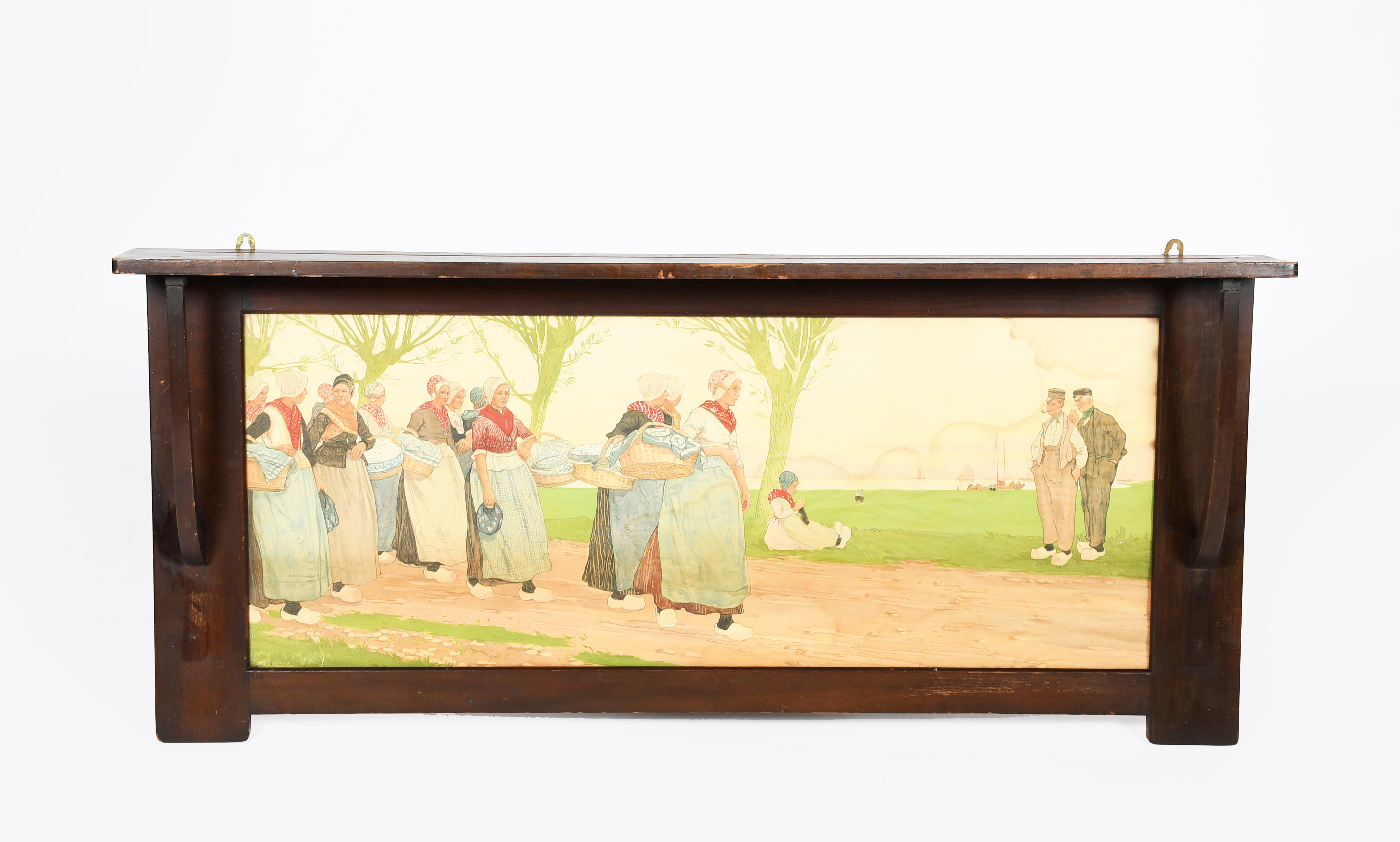 A Liberty & Co mahogany overmantel inset with Dutch Scene lithographic print, rectangular with overhanging plate shelf, set with lithographic scene of Dutch farm workers in a field, applied Liberty & Co label, 122cm wide, 55cm high.