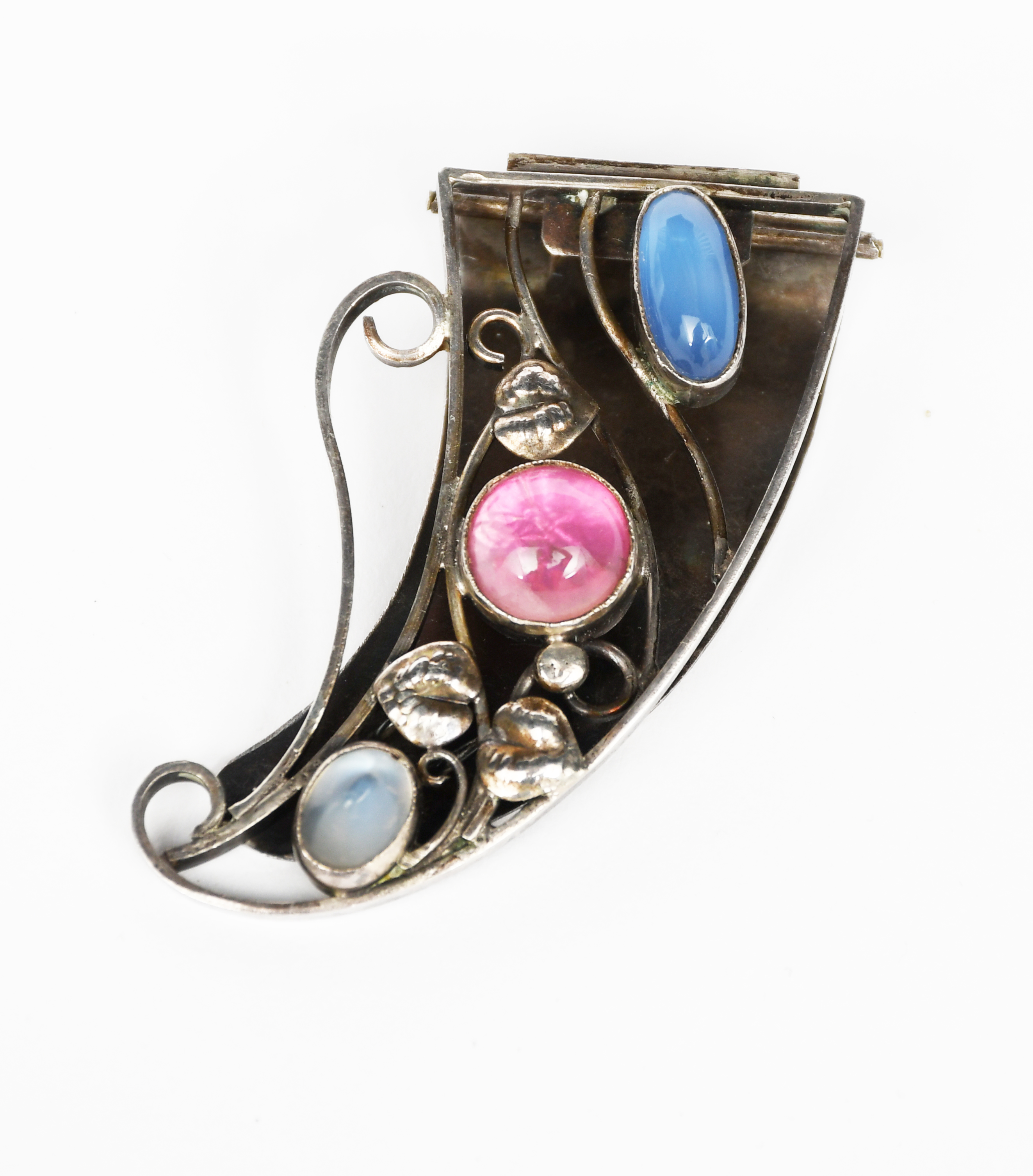 A George Hunt silver cornucopia clip brooch, with scrolling wirework and foliage, set with central pink foil backed cabochon, between moonstone and chalcedony cabochon, stamped GH shield mark, 5.5cm. long