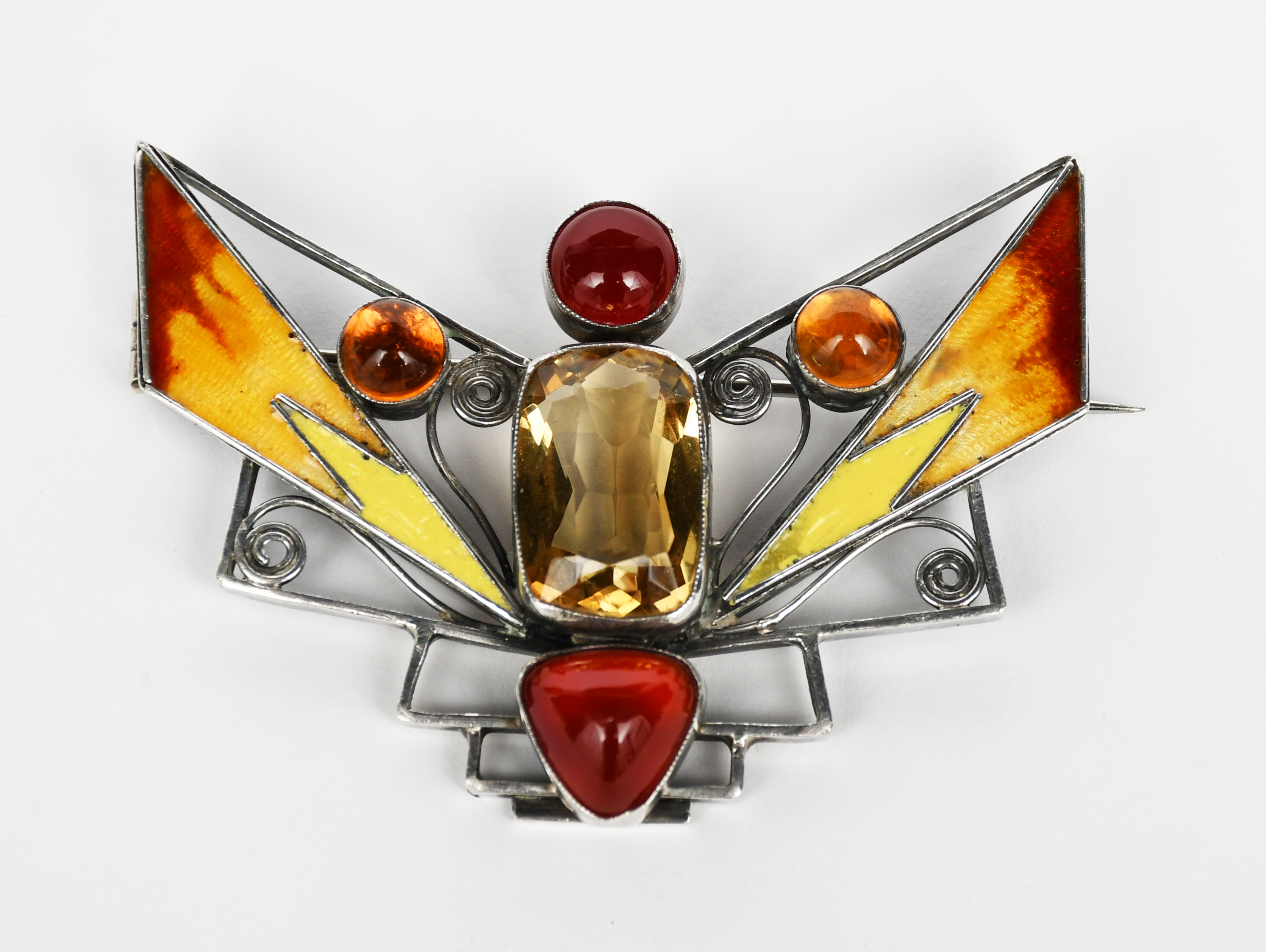 A George Hunt silver and enamel bird brooch, the wirework frame forming an abstract bird or moth form, with orange graduating to yellow enamel wings, set with central large rectangular citrine, with two agate and two citrine cabochon, stamped GH shield mark, 6.5cm. wide.