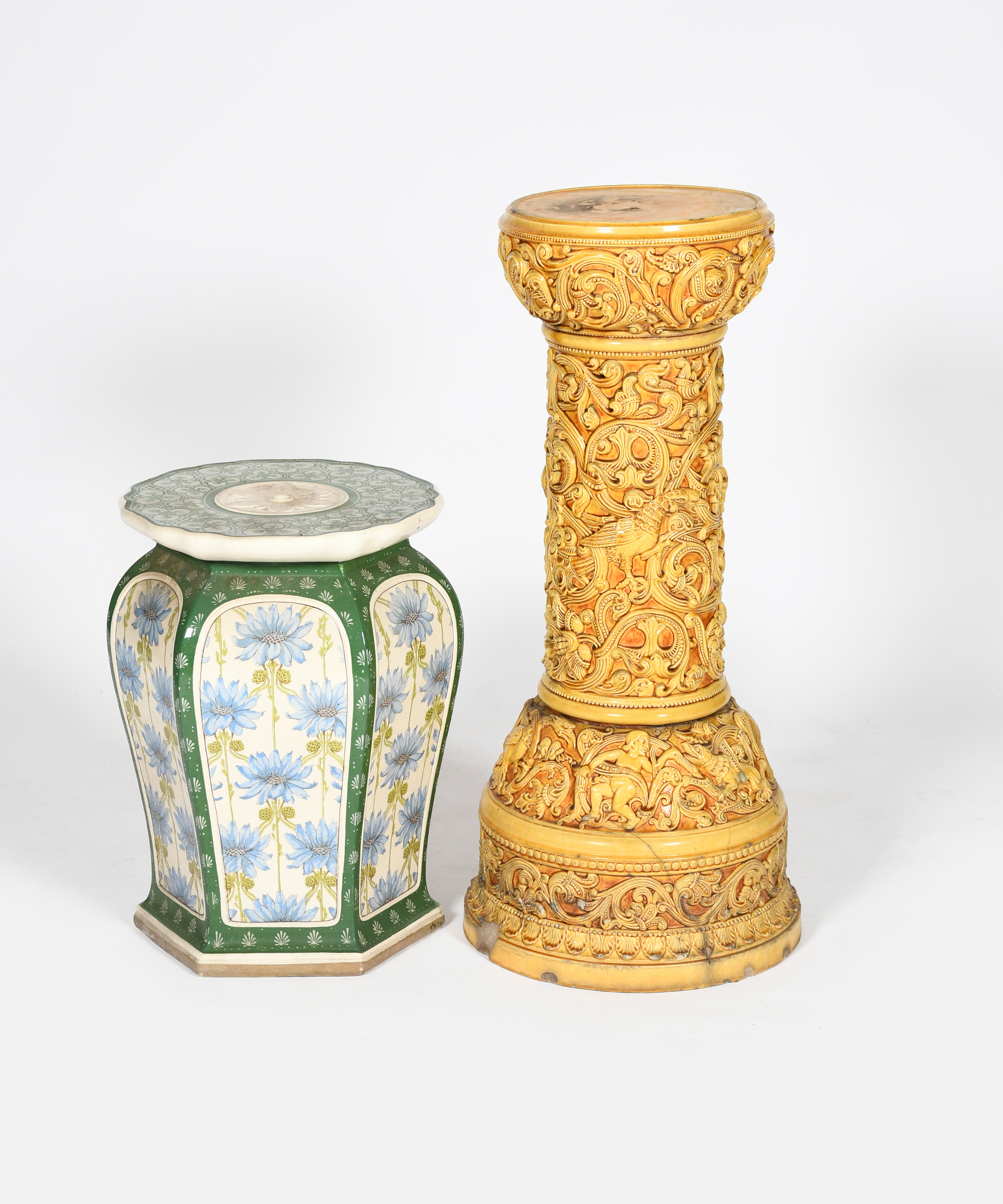 An Art Nouveau Minton's garden seat or Jardiniere stand, model no.3283, hexagonal with circular modelled top, printed with panels of blue cornflowers in blue and green on a white ground and a large jardiniere stand probably Burmantoft's Faience, modelled in low relief with birds amongst scrolling foliage, printed and impressed marks to Mintons, painted shell mark to BF jardiniere, damages, 52cm. high (Minton's), (2)
