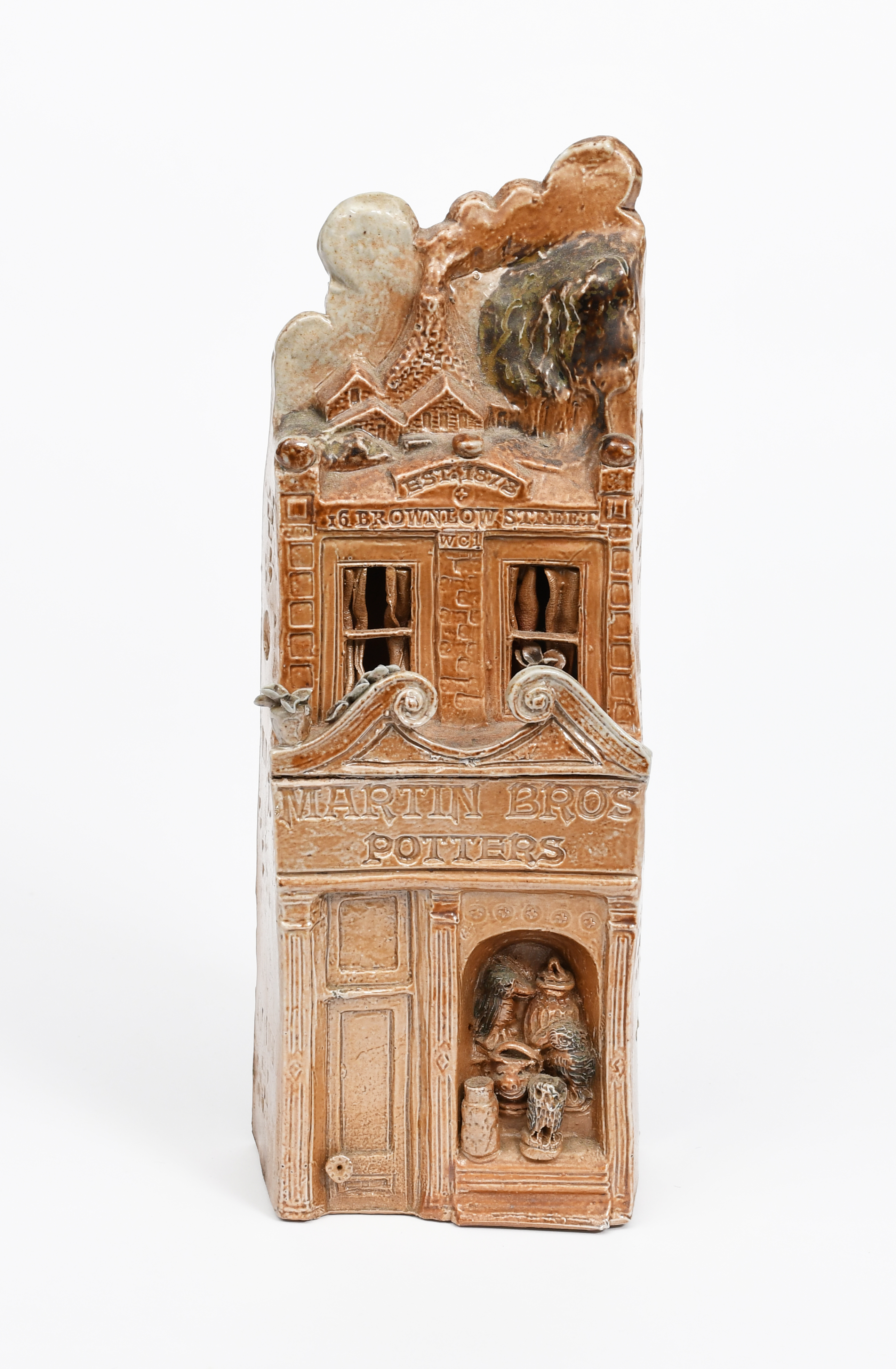 The Martin Brothers Potters a stoneware invite by Ian Gregory for the Richard Dennis Exhibition, 1978, dedicated to Mr & Mrs J Catleugh, modelled as the Potters Brownlow Street shop, impressed marks, minor chips to flowers, 25cm. high