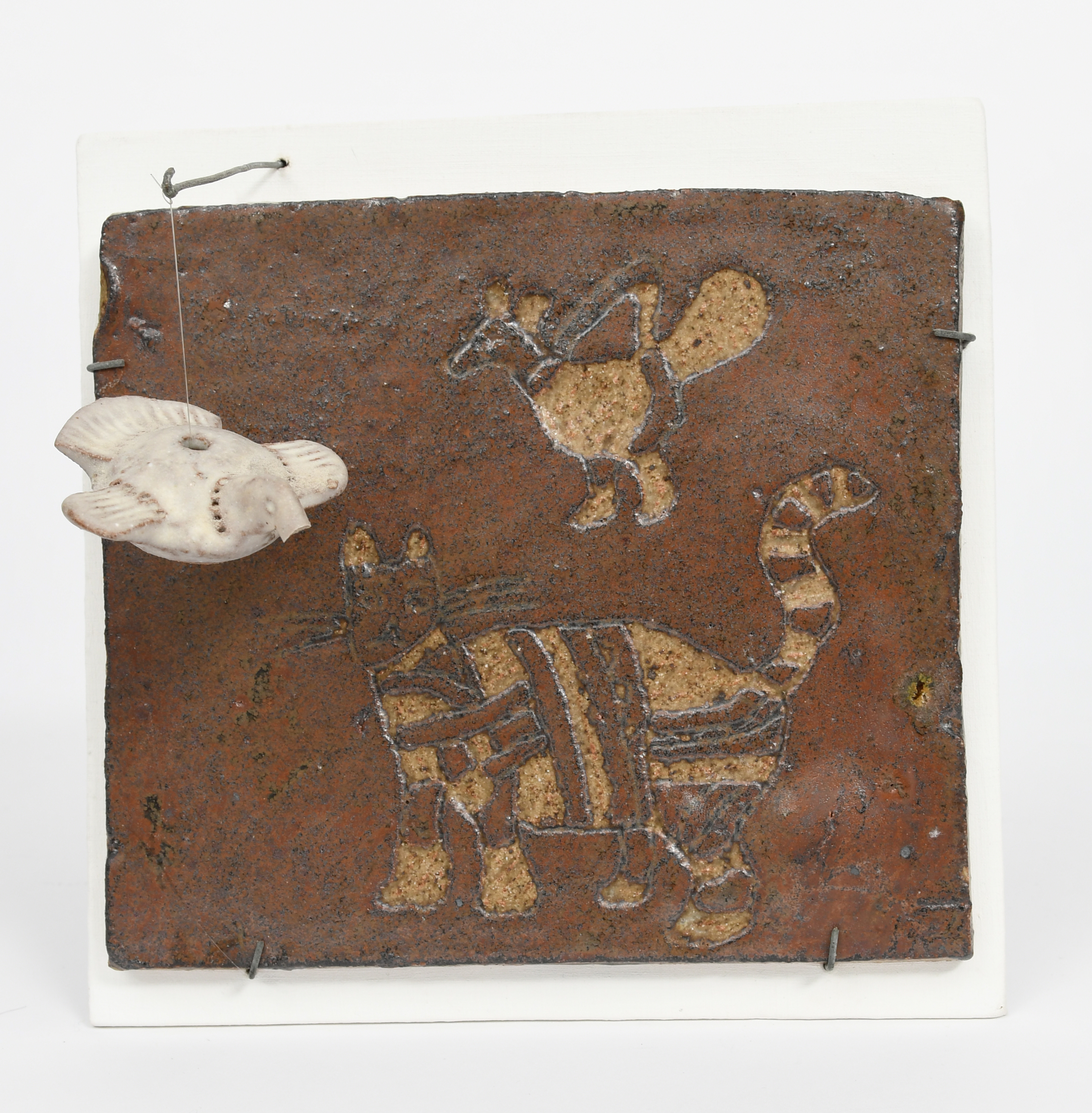 a stoneware tile, resist decorated with a cat and bird design in tenmoku, mounted by Jon Catleugh, with hanging Ian Godfrey bird, marks concealed, 16.5 x 14.5cm. (tile)