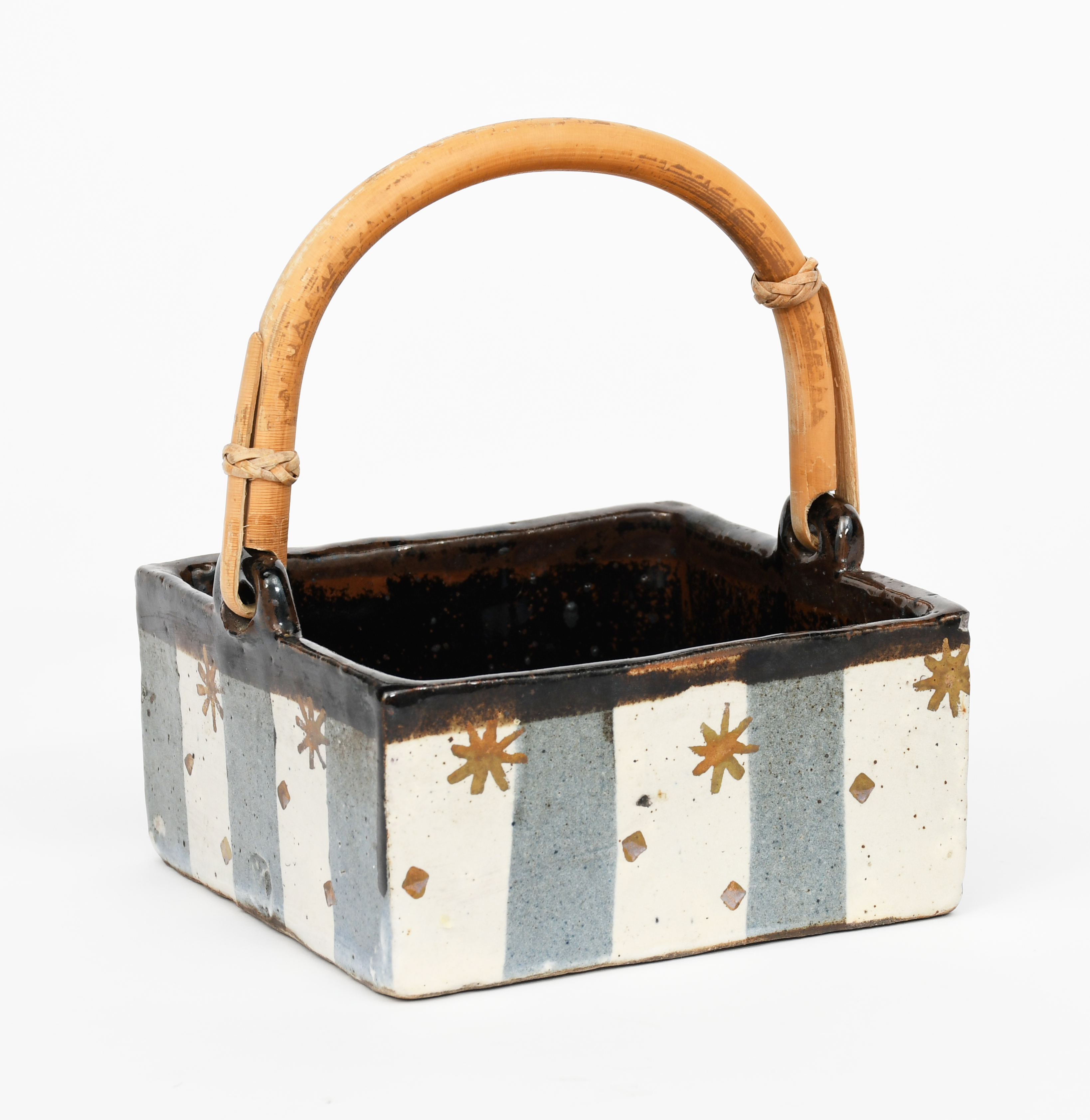 a stoneware square dish with bamboo handle, painted with gold stars on a striped blue and grey ground, the interior tenmoku,