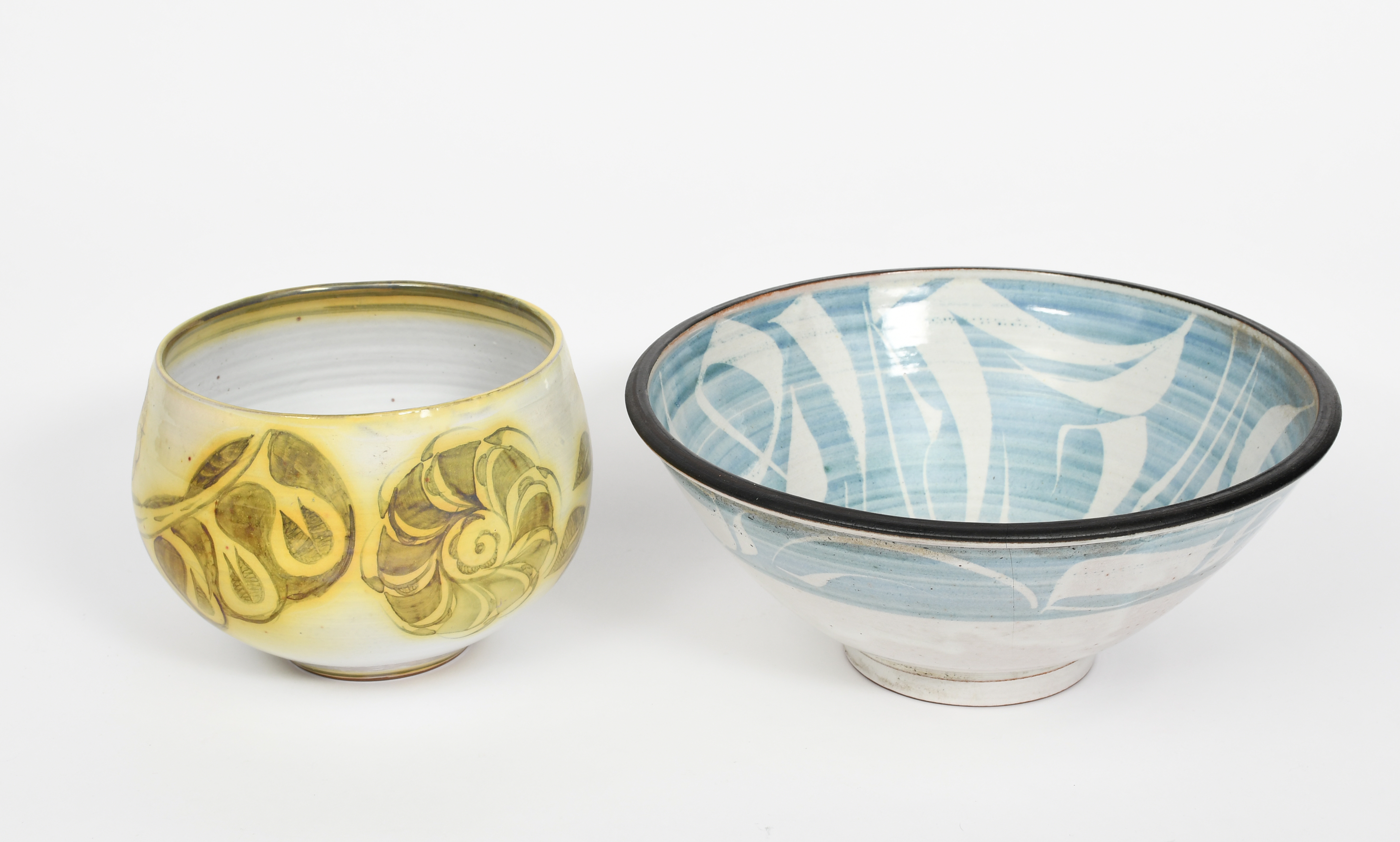 painted with a stylised dove with laurel branch in it's beak, in golden lustre on a tin-glaze, and another Aldermaston Pottery bowl by Alan Caiger Smith, dated 1980